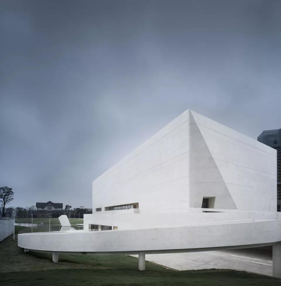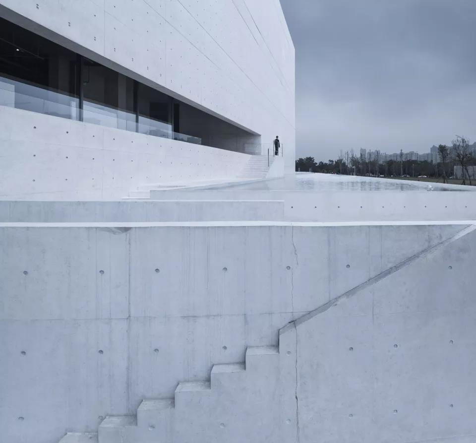 建筑主體由白色清水混凝土一次性現澆而成,無論墻體,頂棚、地面或室外廣場、平臺、棧道都只使用清水混凝土一種材料,做法本身就是超越性的。