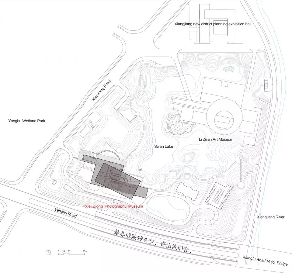 謝子龍影像藝術館建在湘江河畔,長沙洋湖濕地公園之內。所在基地恰好處于濕地公園連接湘江風光帶的視覺廊道上,是政府重點打造的市民文化藝術高地。影像館同我們之前已經完成的湘江新區規劃展示館(2009年)、李自健美術館(2016年)共同構成了洋湖市民的文化客廳。