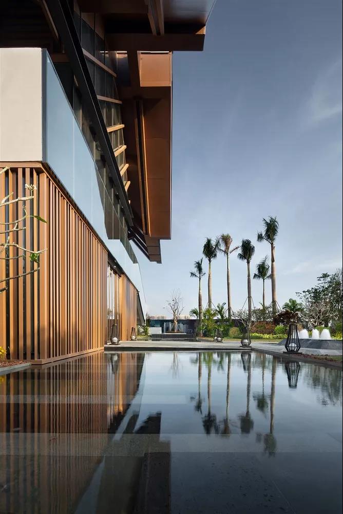 在建筑主體的材料使用上,我們選擇了與海南當(dāng)?shù)亟ㄖL(fēng)格呼應(yīng)的材料組合。屋頂和主體使用了木飾面材料,聆聽自然,走近生態(tài)海南;局部使用了白色和鏡面的金屬材料,提升現(xiàn)代工業(yè)美感的同時(shí),以簡(jiǎn)潔明亮的線條勾勒整體。另選用高透玻璃強(qiáng)化虛實(shí)對(duì)比和節(jié)奏變化,使建筑同時(shí)展現(xiàn)出明快、輕盈、自然和富有文化等藝術(shù)品質(zhì)。