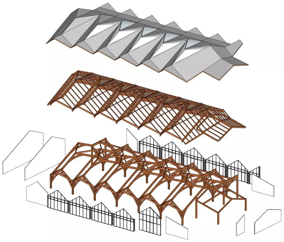建筑以較小的建造代價,塑造了精彩的空間與迷人的形式,充分體現了木結構自然、溫暖的質感,以及幾何學與力學的美感。