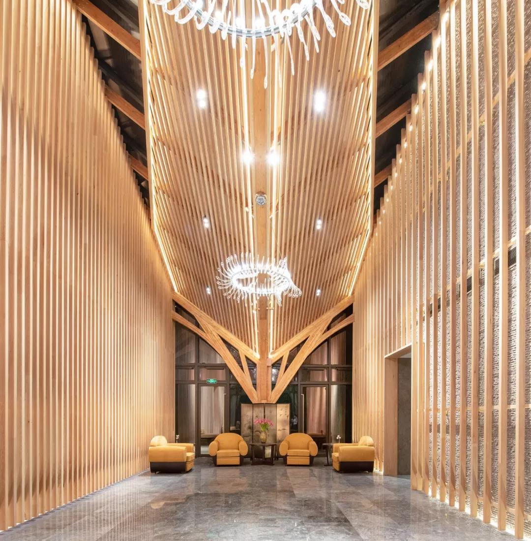 建筑室內裝飾也以木材為主要材料,通過木格柵疏密相間的設置,呈現出中國古代寫意山水畫的線條與肌理,隱喻了中國傳統中對寧靜、悠遠的自然環境的向往,及其所代表的“天人合一”的理念與暗含的智慧與品德。