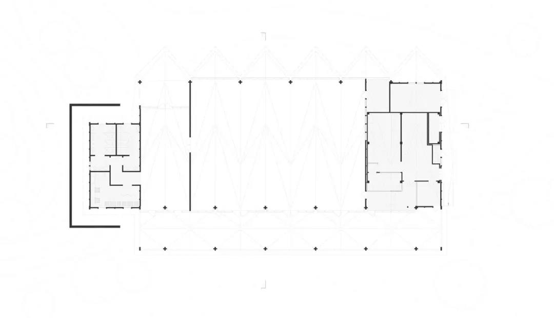 屋面采用折板形態,尺度相等的折板相互錯落拼合,幾何邏輯清晰、簡練,所形成的室內空間靈動且個性鮮明,兼具層次感與秩序感,同時又帶有傳統建筑質樸優雅的韻味。折板屋面頂部設置天窗,改善林間建筑幽暗的采光條件,當陽光從天窗照射下來,仿佛穿過樹木的枝葉投下重重光暈。