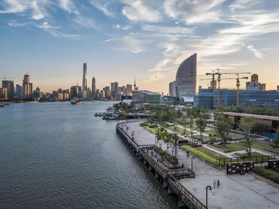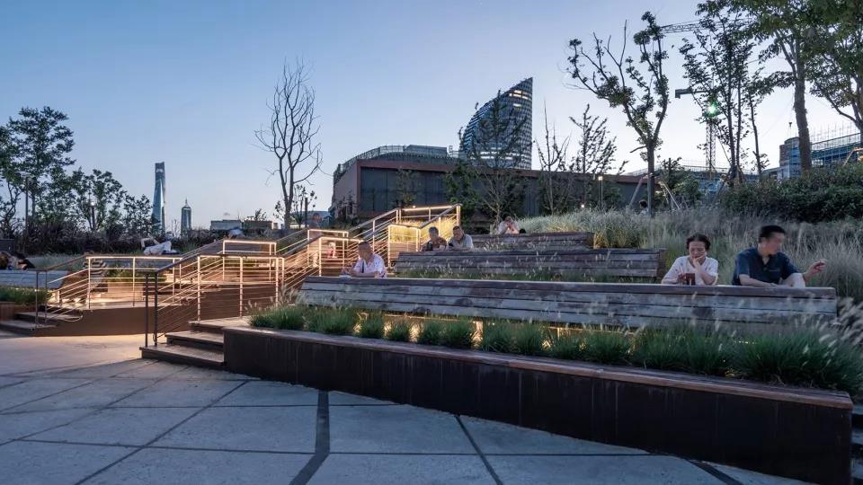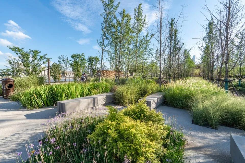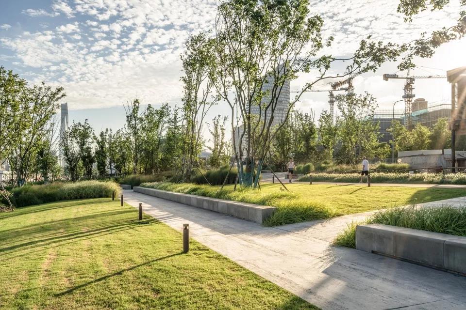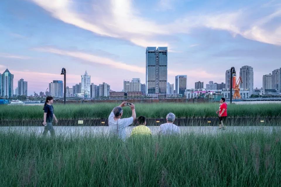 面對江面的6%草坡,可供人們舒適地欣賞黃浦江美麗的城市天際線。新的防汛體系以彈性的方式在減少臺風和暴雨威脅的同時,豐富了景觀地形的變化。
