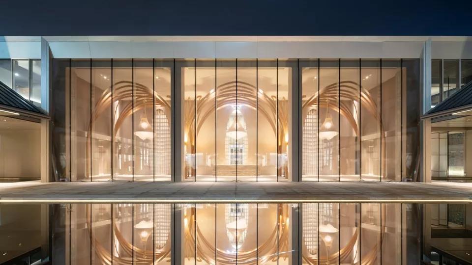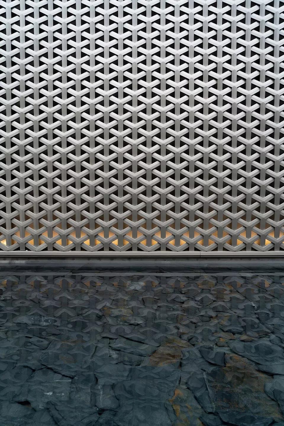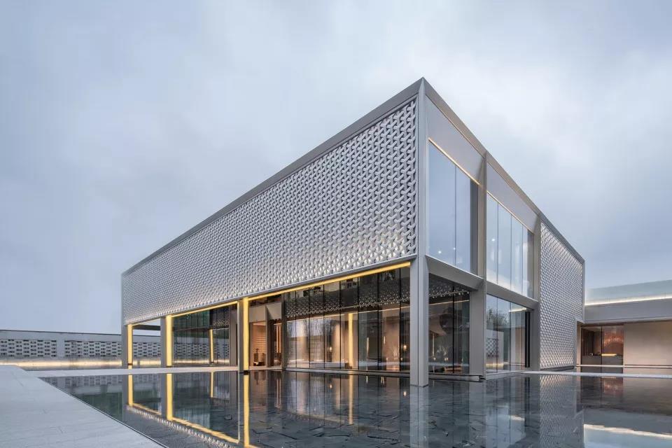 主樓三面環水,外墻底部與水面的交接處設計了倒三角形的收邊線條,將主樓輕盈地托起,營造出懸浮于水面上的視覺效果。