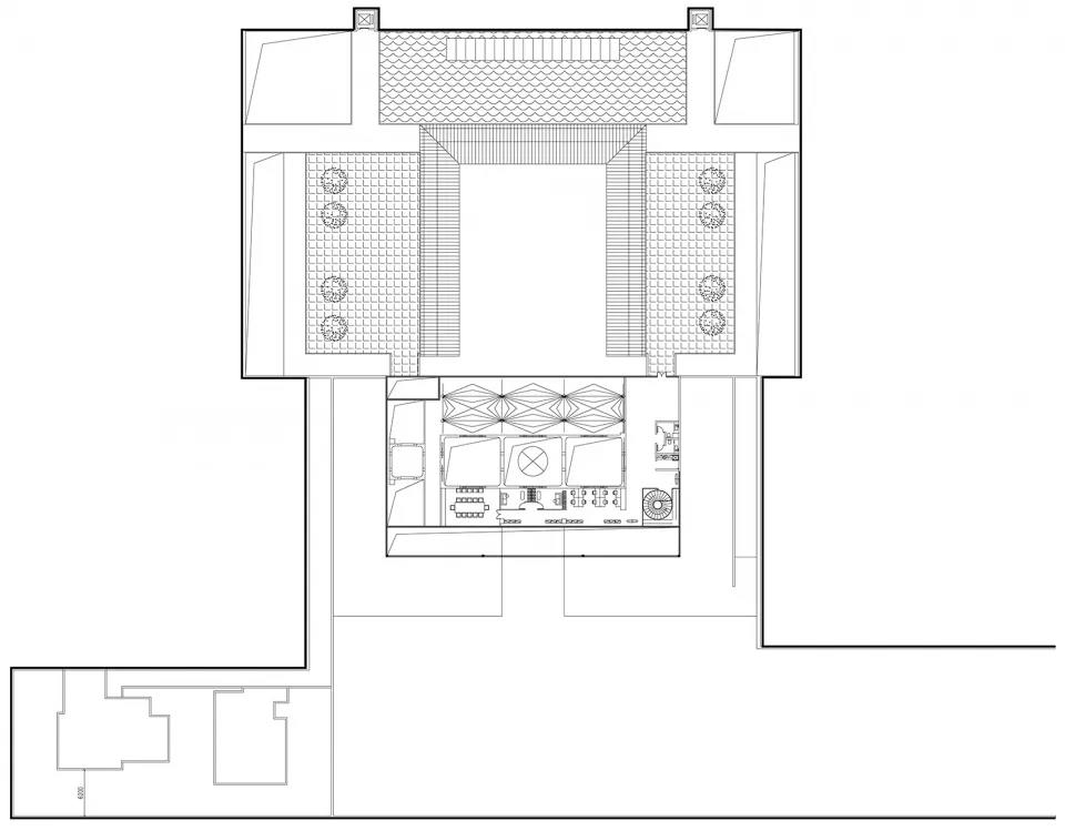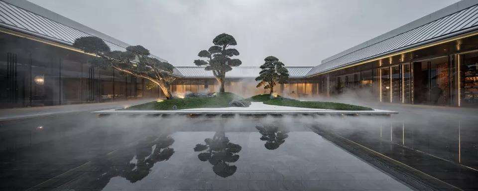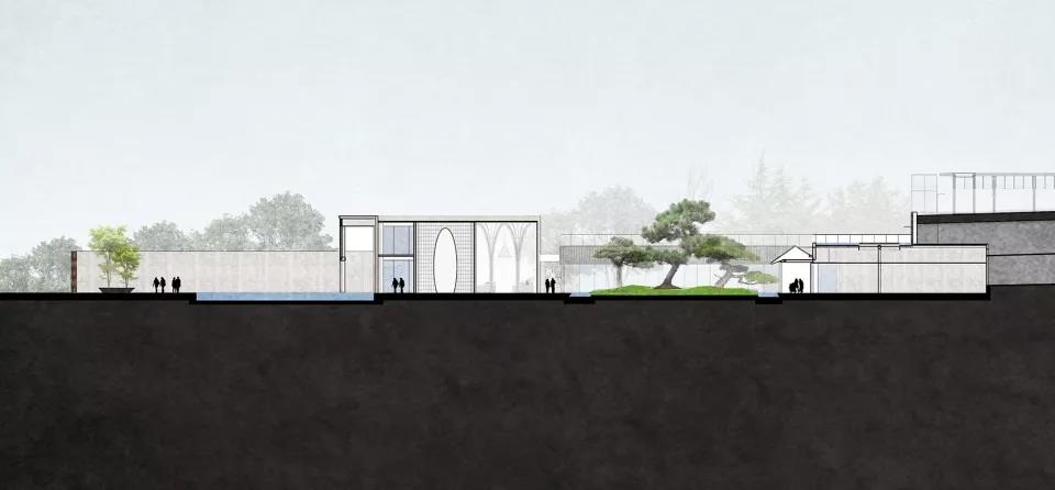 內院的中心是以三棵精心布置的松樹為主體的巨大盆景。大尺度的挑檐為外廊上停留的觀眾框出天空的畫面,也為室內靜思的閑客描繪了一幅寧靜悠遠的松石畫卷。
