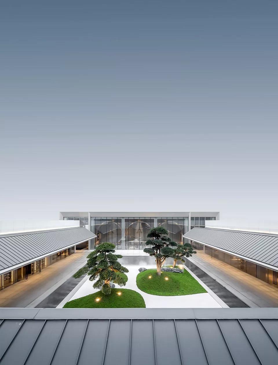 外廊通過延展的玻璃面、大尺度的灰空間、盆景式的內院,實現從室內到室外,由建筑到景觀無界限的自然延續。為了給近人尺度提供舒適的空間體驗,設計將大挑檐拆分成平屋面與坡屋面兩個層次。