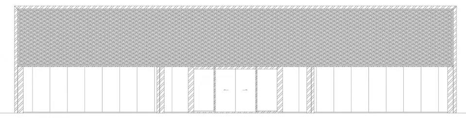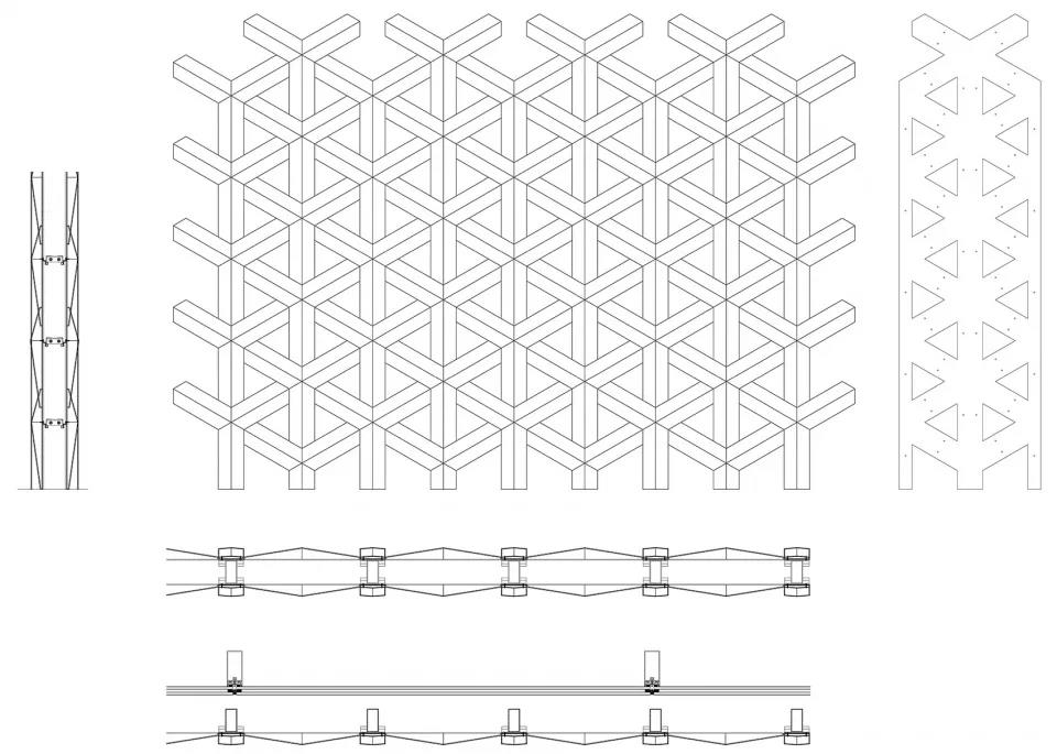 由于挑檐的結構層次復雜,因此在其側立面的設計中,將雙坡屋面、平面吊頂、坡面吊頂、檐口線條等多種元素,經過拆解和整合,將無機的形狀轉化成有機的形態,以表達“形式體現結構”的設計邏輯。