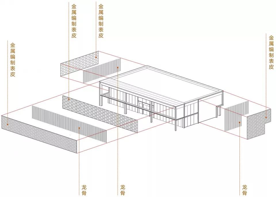 外框的立柱落于水中,水面以上外飾鋁板,水面以下外包不銹鋼板。隨著水面的漣漪變化,不銹鋼板會將光影的韻律折射在建筑之上。
