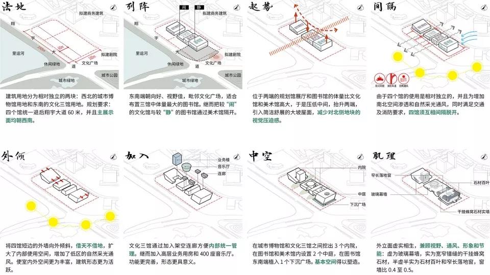 建筑用地為平行翔宇大道的矩形,長(zhǎng)350米,寬160米,分為相對(duì)獨(dú)立的兩塊:西北的城市博物館用地和東南的文化三館用地。規(guī)劃要求:四個(gè)館統(tǒng)一退后翔宇大道60米形成主要展示面。作為體量龐大的首發(fā)項(xiàng)目,如何能引領(lǐng)新城風(fēng)貌、呼應(yīng)老城文脈、形成地方親和力?