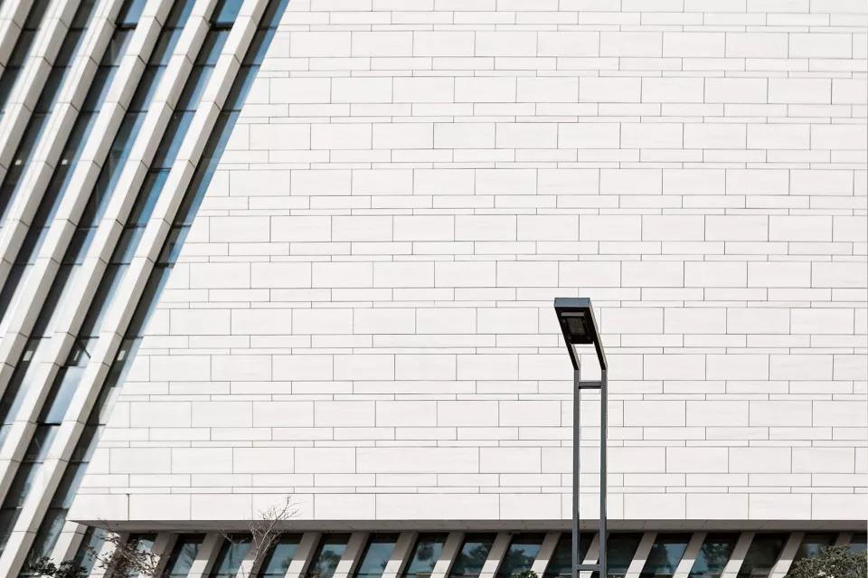 石材百葉:閱覽室、工作室等采用了“石材百葉”和玻璃幕墻的結(jié)合,兼顧了功能、視野、形象和節(jié)能。將蜂窩石材板拼接成300寬×450深的通長(zhǎng)柱狀構(gòu)件,再按1050中心距橫向排開,窗洞寬度約750。