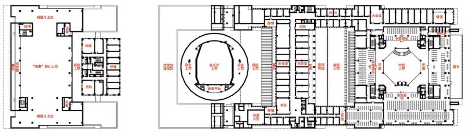 有機(jī)整合的設(shè)備裝置:以音樂(lè)廳為例,平面接近矩形,高約10米,兩側(cè)需布置大型暖通設(shè)備,于是將平面整合成圓形,并結(jié)合設(shè)備通風(fēng),外墻均布百葉,繼而生成了12片外傾墻,仿佛綻放的月季花瓣。