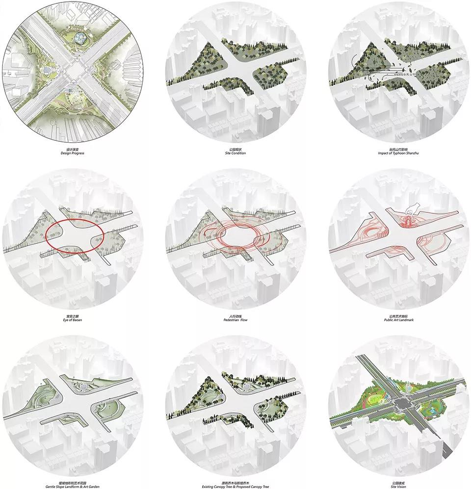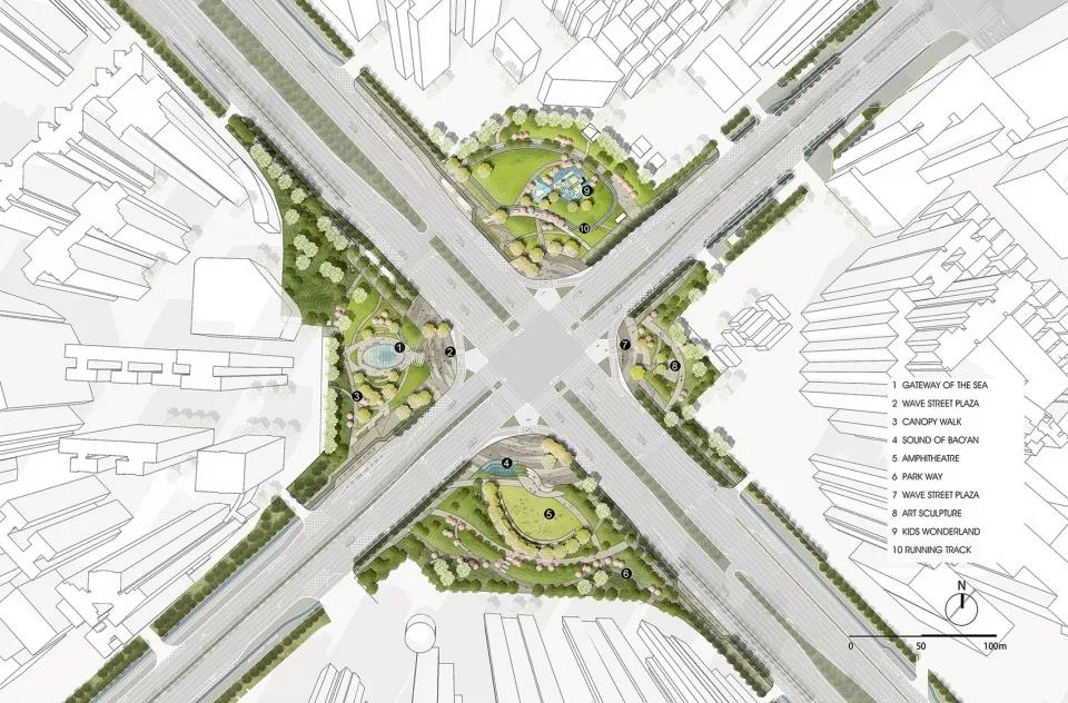 設計采用了寶安之眼的概念,用一個“環”將被道路分割成為四個街角綠地的地塊視覺上成為一個整體,運用波浪鋪裝、藝術雕塑、弧形看臺等元素,將這個環變得豐富,為行人提供停留和望遠的視線。在設計過程中遭遇了200年一遇的山竹臺風,大量的喬木被吹倒。