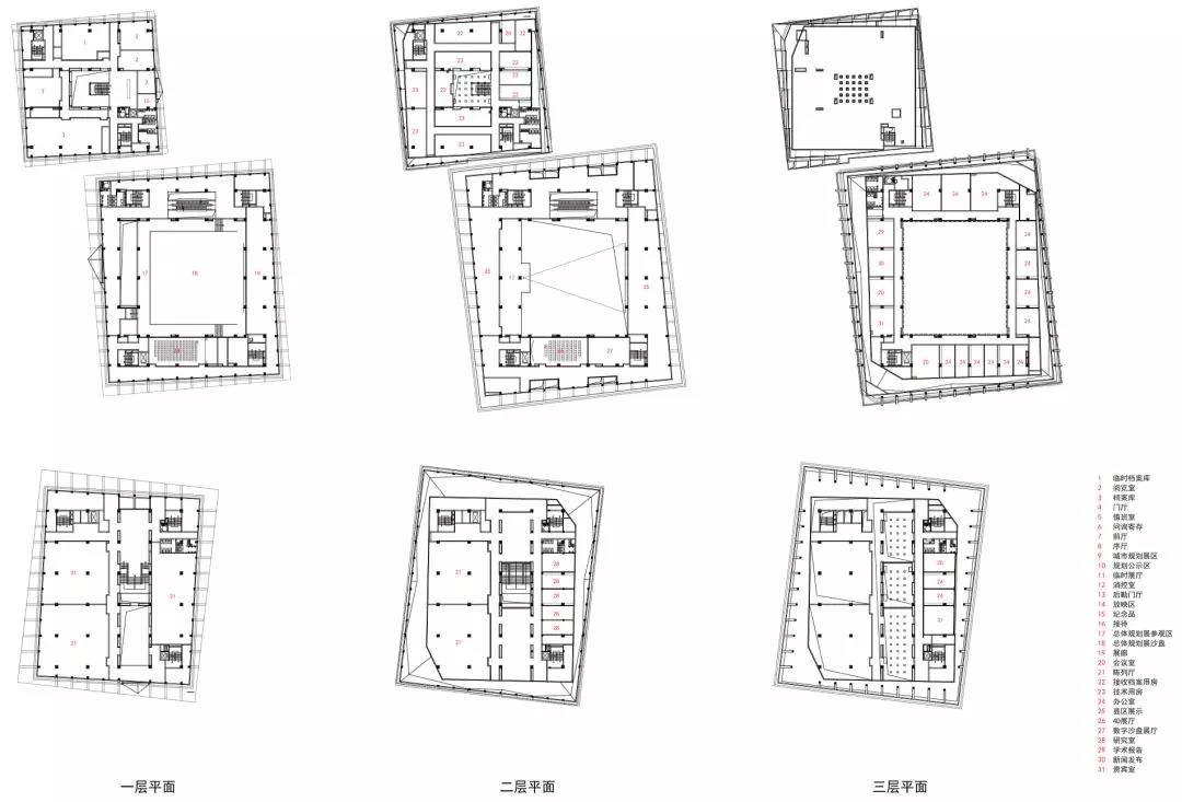 設計首先避免了追求建筑體量的整體式布局,由南至北依次布局城建檔案館、城市規劃展示館、博物館三個建筑體量,根據使用人群、面積、方式,三個體量大小不一、東西錯落布局,在基地兩側的城市廣場與城市道路方向形成若干尺度不同室外空間,根據建筑的使用功能設置了不同的內容和景觀要素,從而明晰了人群進入建筑和游玩的方式。另外這些室外空間形成了城市道路與中心廣場之間的過渡,豐富了城市中心廣場的尺度感和功能性,給恢弘的城市中心廣場賦予了市民的氣息。