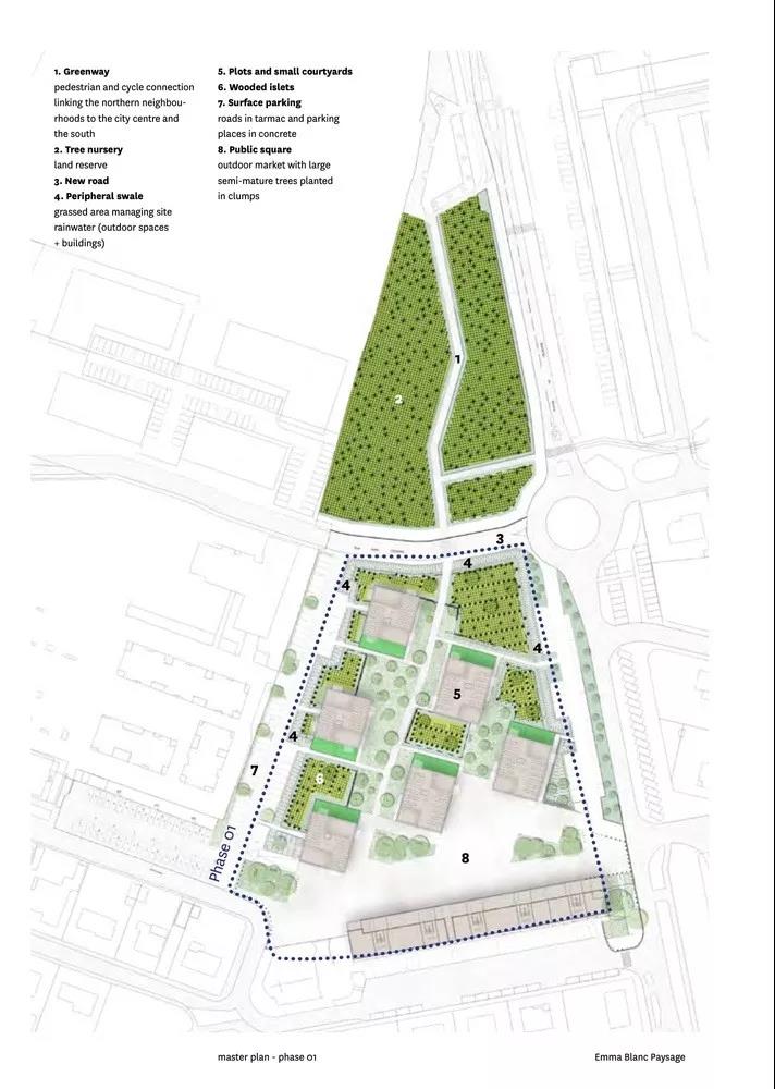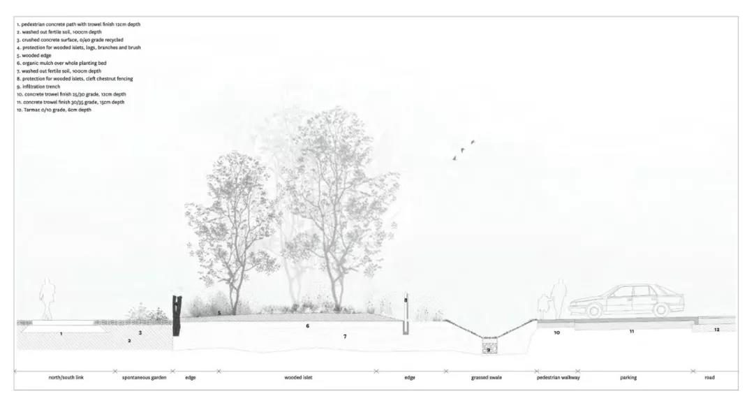 南北軸上的一條步行小徑和自行車道重新建立了舊中心與北米雷的聯系。一條新道路讓人們可以東西向穿行,并合理地重新組織了從內部到社區外部的交通流線。