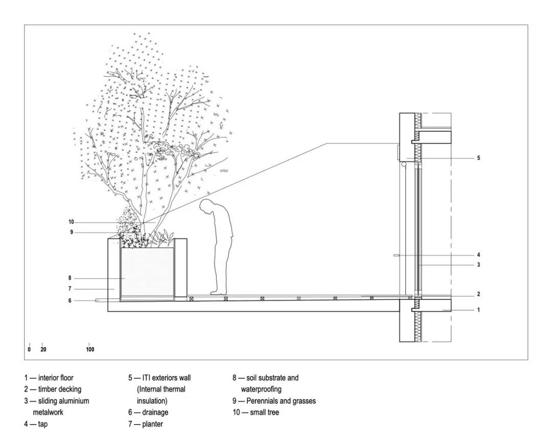 夢想中房屋的樣子總是與擁有一個陽臺、一個花園或是有能看見廣闊天空的視野從而與自然緊密接觸的渴望聯系在一起。帶有植被覆蓋的雙層高陽臺是此住宅的特色,使這個一層層疊加的住宅樓給人一種獨立房屋的感覺,創造了類似“樓中別墅”的樣式。