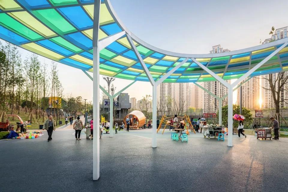 公園中心廊架遠景,色彩鮮明、造型質樸