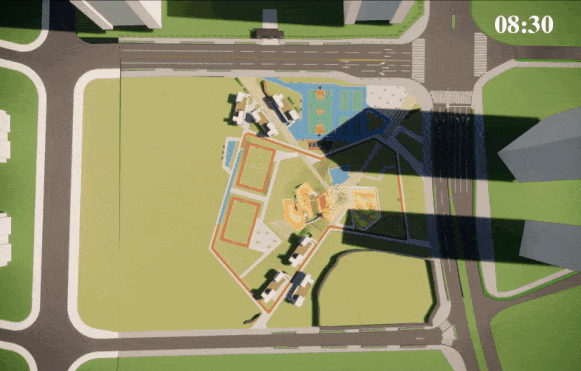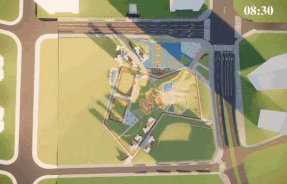 重慶素有火爐之稱。在實地考察時,設計團隊發現周邊樓盤的影子恰好覆蓋在地塊中,而公園人流最盛莫過于早晚時分,由此萌生結合當地日照環境布置園區景觀功能的想法,以降低場所能量的損耗,增加使用者的舒適度。