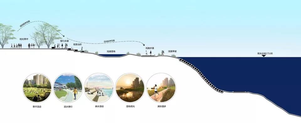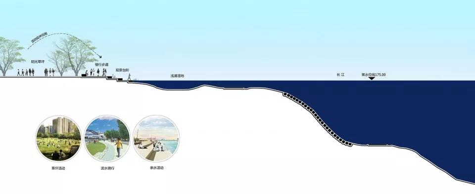 設計高程175-173m,將打造濕地風貌景觀,營造雨水花園,種植濕地植物,利用經過江水沖刷形成的自然灘涂,打造適合市民進行燒烤、露營的親水空間。