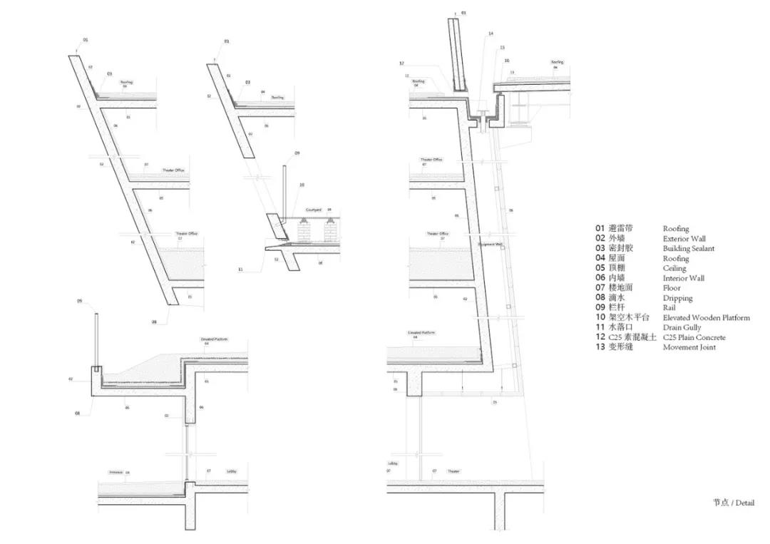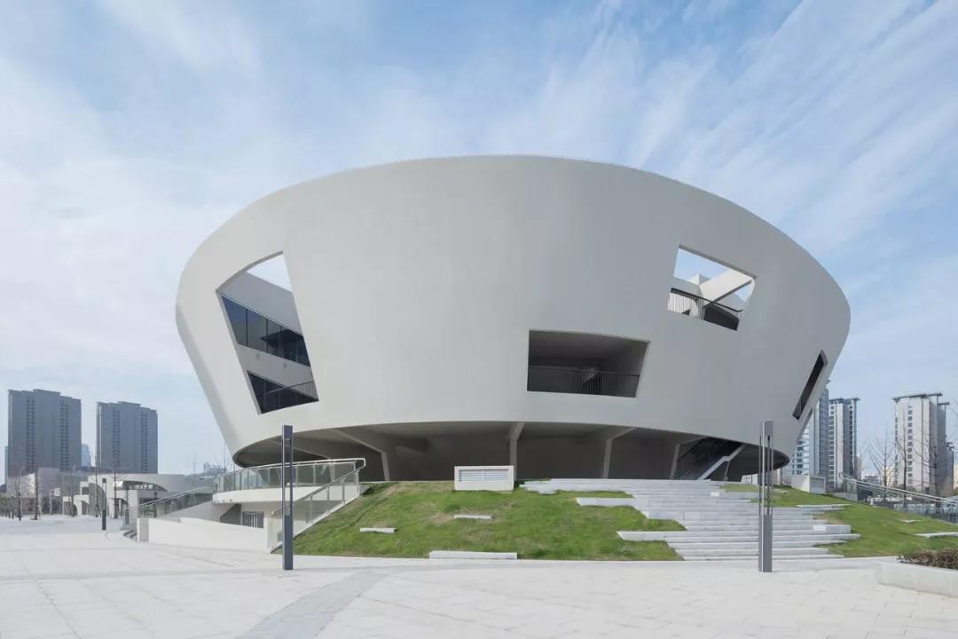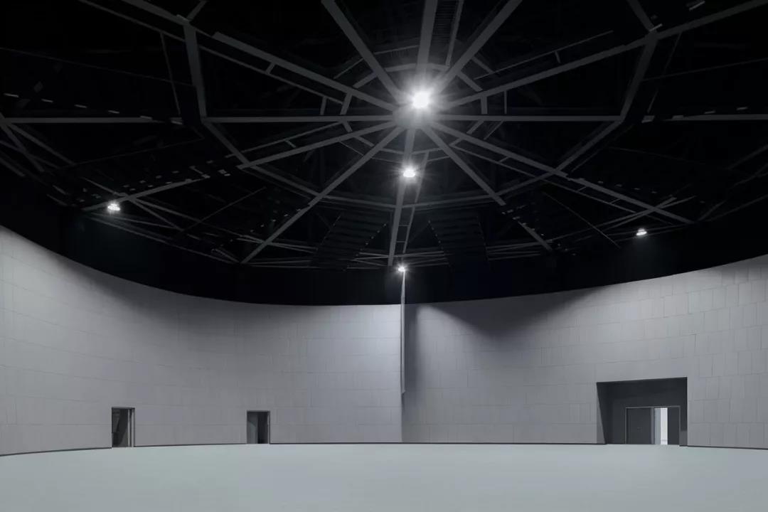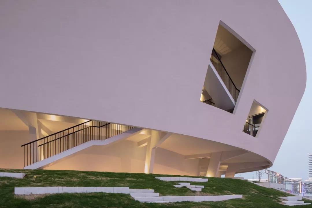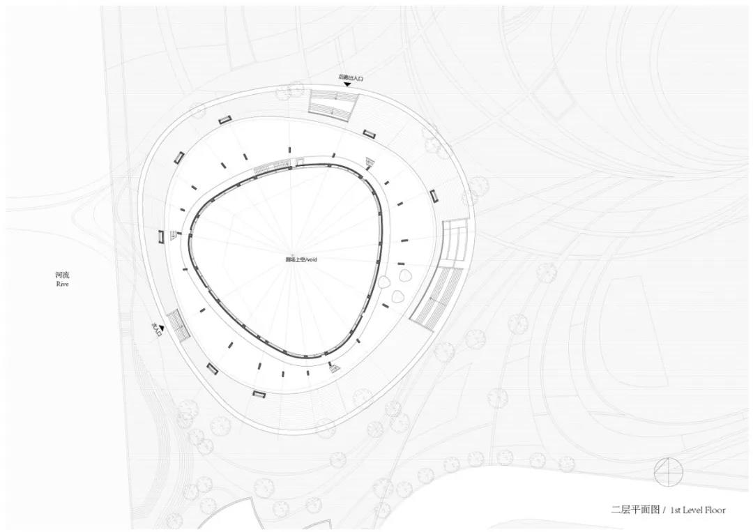 處于內環的4層通高的秀場場館與城市廣場下沉半層高差,觀眾通過與廣場相連的大臺階直接進入。其后勤及設備房間被斜坡植被覆蓋位于架空層下,后勤及展品通過地下車庫進入。不同高差處理達到分流作用,互不干擾,適應不同使用模式。