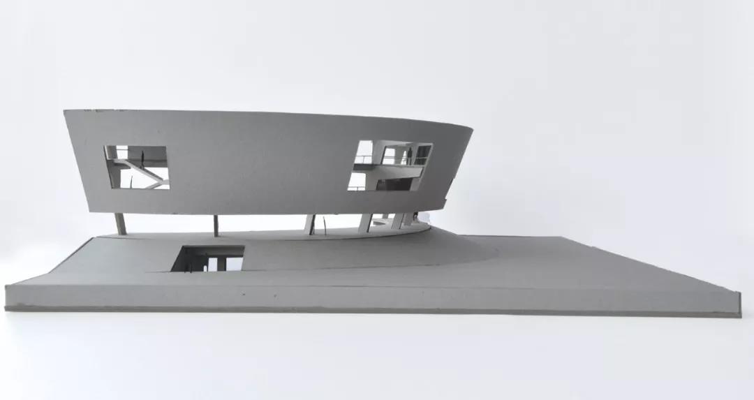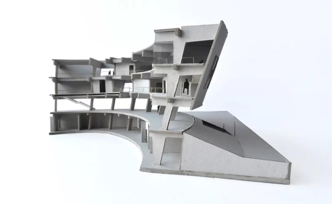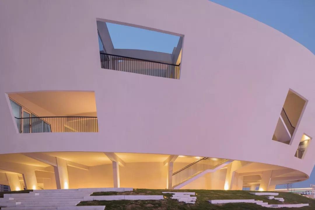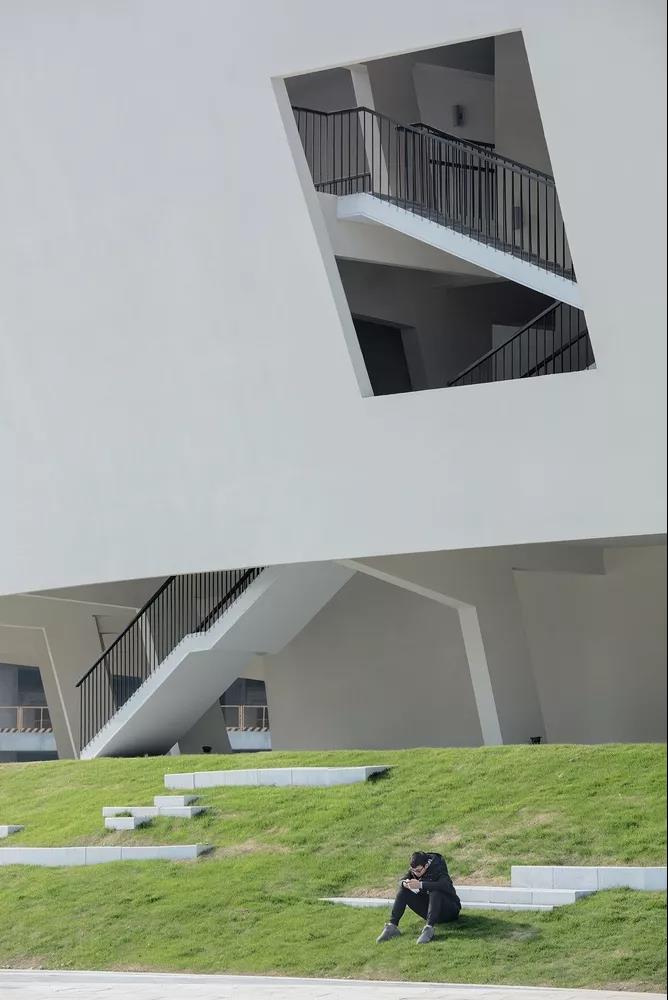 建筑布局如洋蔥式,兩層向外傾斜的環形墻體從外到內清晰界定了日常型空間及事件型空間。處于內外環之間的日常型空間設于三、四樓,通過二層的架空及斜坡與城市廣場連成一體,為市民提供一個良好的可達性。局部樓板鏤空及戶外庭院的設置產生空間流動性,模糊了室內的界限,同時讓二層架空層的綠植往上滲透進一步模糊了上下空間的界面。所有日常型空間通過內置庭院通風采光,利用陰影溫差產生氣壓達到自然通風作用,適合南方氣候特點同時使得外環立面呈現洞口“舞臺”形象,每個洞口均面對城市不同場景:音樂噴泉、接待中心、河岸、婚慶廣場、回轉藝廊等,產生步移景換的戲劇性效果。外環材料單一性保持“環”的空間概念清晰可讀,創造一個內向開放的空間氛圍。