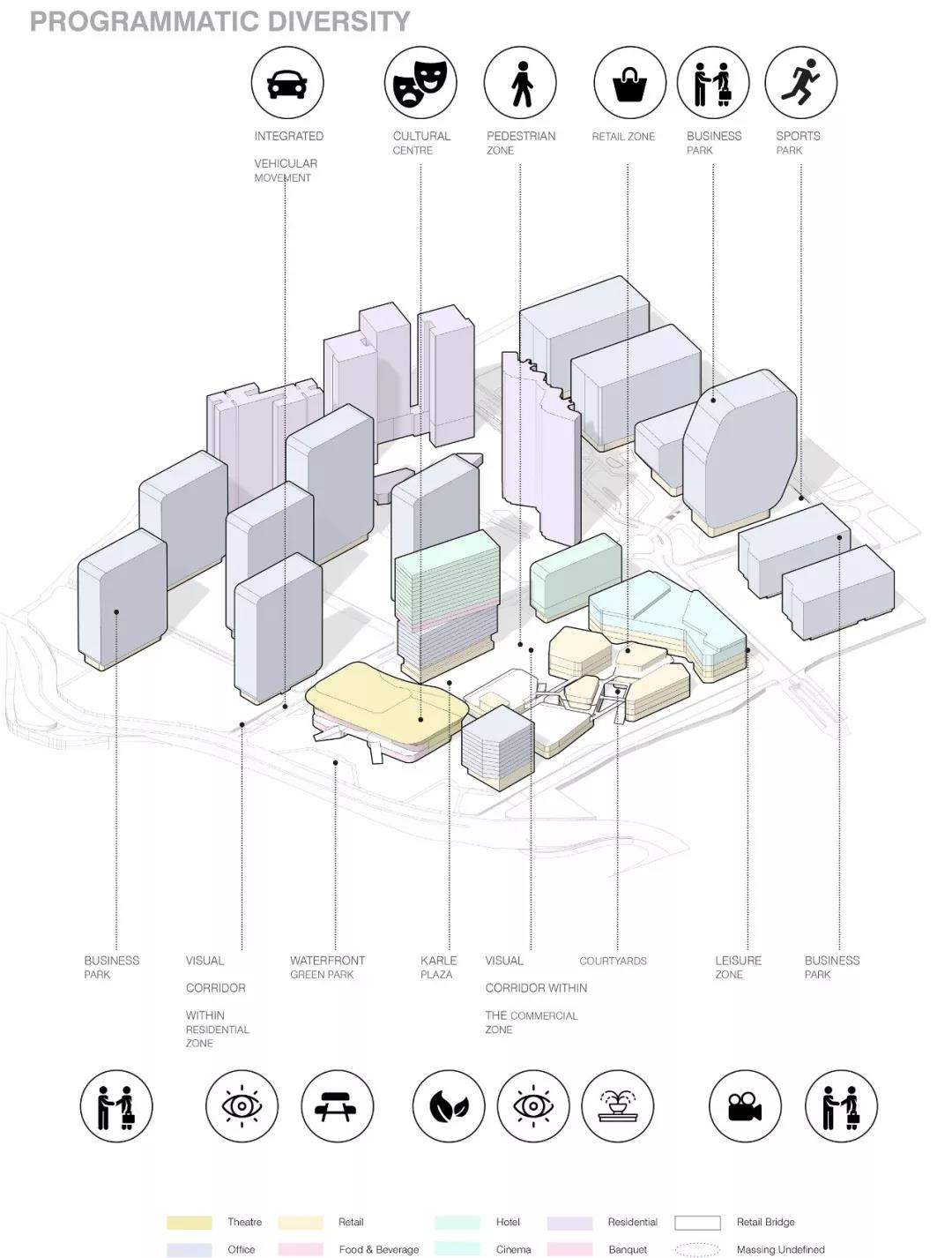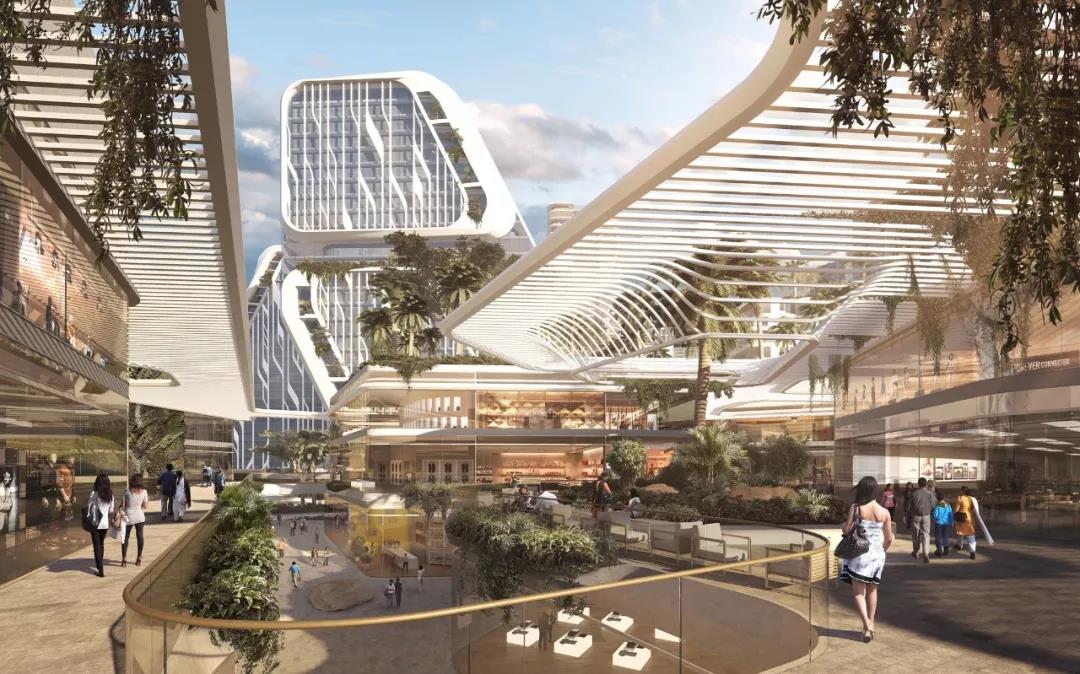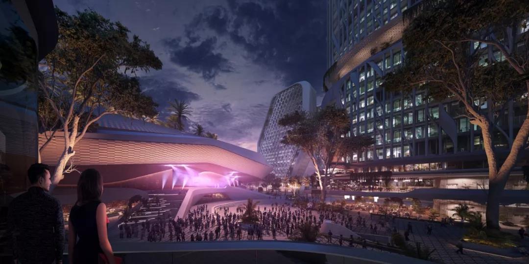 總體規(guī)劃的目的是要讓每棟建筑都變成“自己繁榮的城市縮影”。“從根本上說,對于商業(yè)來說,該項目還提供了一個工作、生活和娛樂的環(huán)境,以確保各種用戶在白天和晚上都有活動。總體規(guī)劃的文化支柱包括中央大劇院、活動廣場廣場和一座高架鐵路候車平臺。