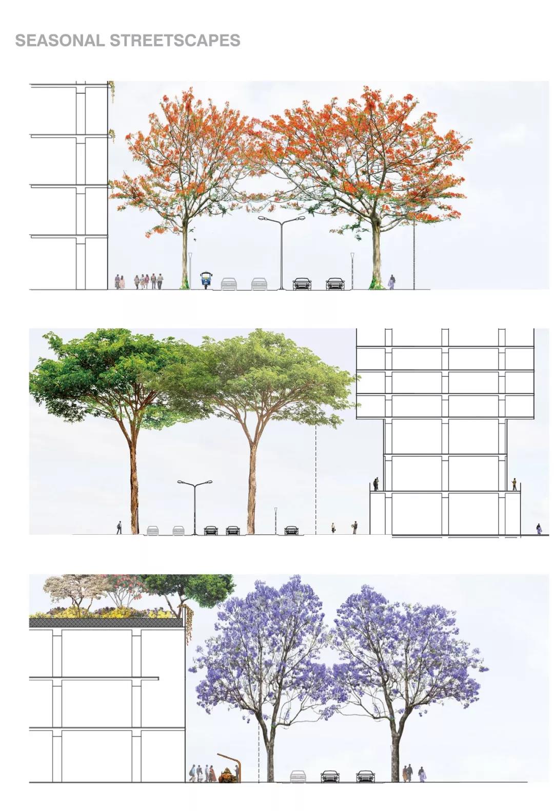 該項規(guī)劃還提出了解決城市綠地減少的方案,希望將班加羅爾打造成一座21世紀花園城市。UNStudio 建筑事務(wù)所與 BALJON 景觀建筑事務(wù)所 合作,設(shè)計了一個具有可持續(xù)性發(fā)展的、有彈性的景觀規(guī)劃,該規(guī)劃與最為休閑場所的花園相連接。特別注重湖濱步道的推廣,為林蔭大道提供植被,并整合了空中花園。