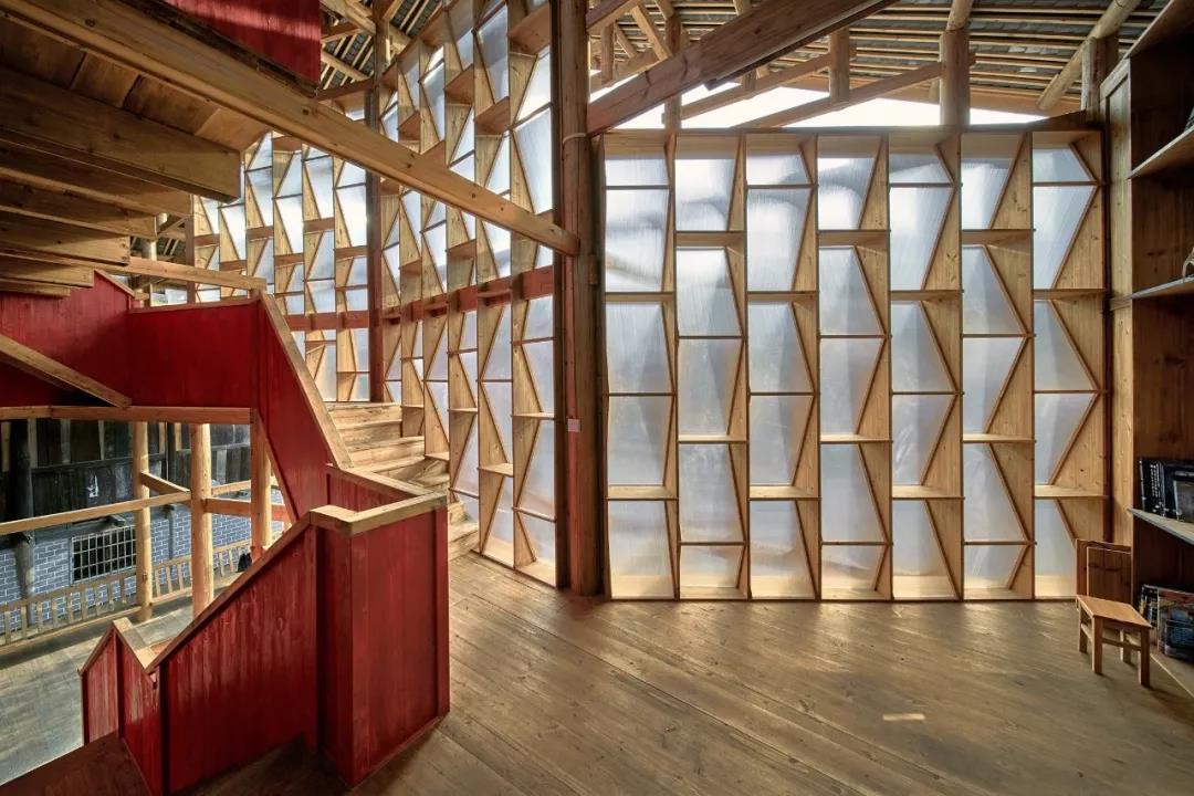 高步書屋面積約二百平方米,主要由木屋架組成。底層中心處貫通整座書屋的樓梯,是它的標(biāo)志性元素。書屋底層的開放空間讓村民可以休息,或者舉辦展覽和其他活動(dòng);二層和三層則由不同主題的圖書書架構(gòu)成外墻,樓梯的設(shè)計(jì)緊貼著由半透明陽光板構(gòu)成的書屋立面。