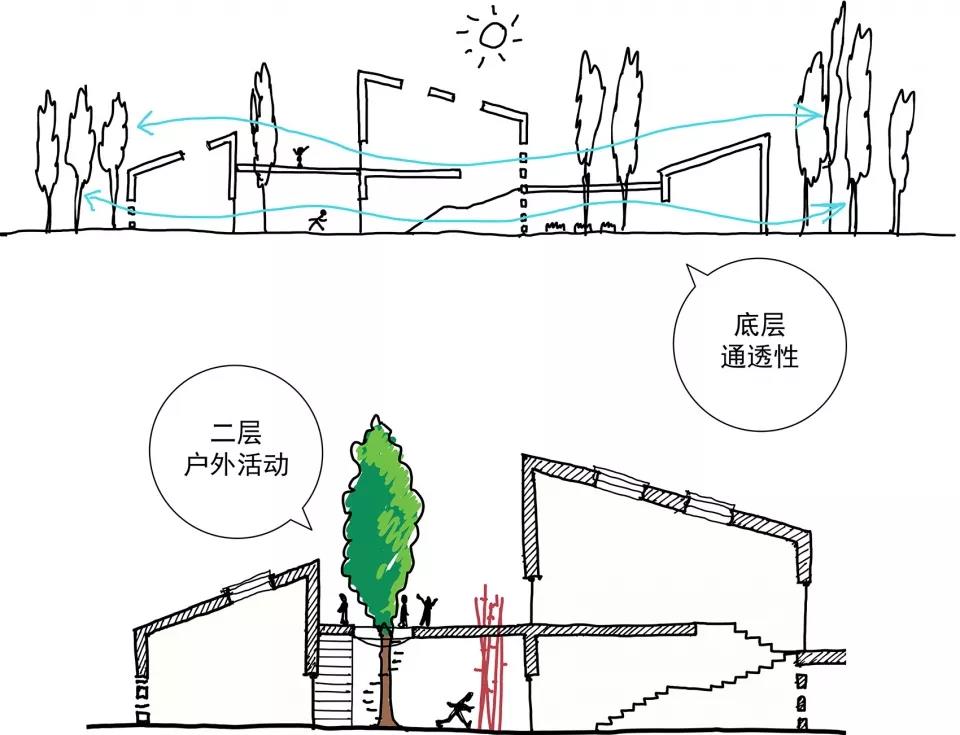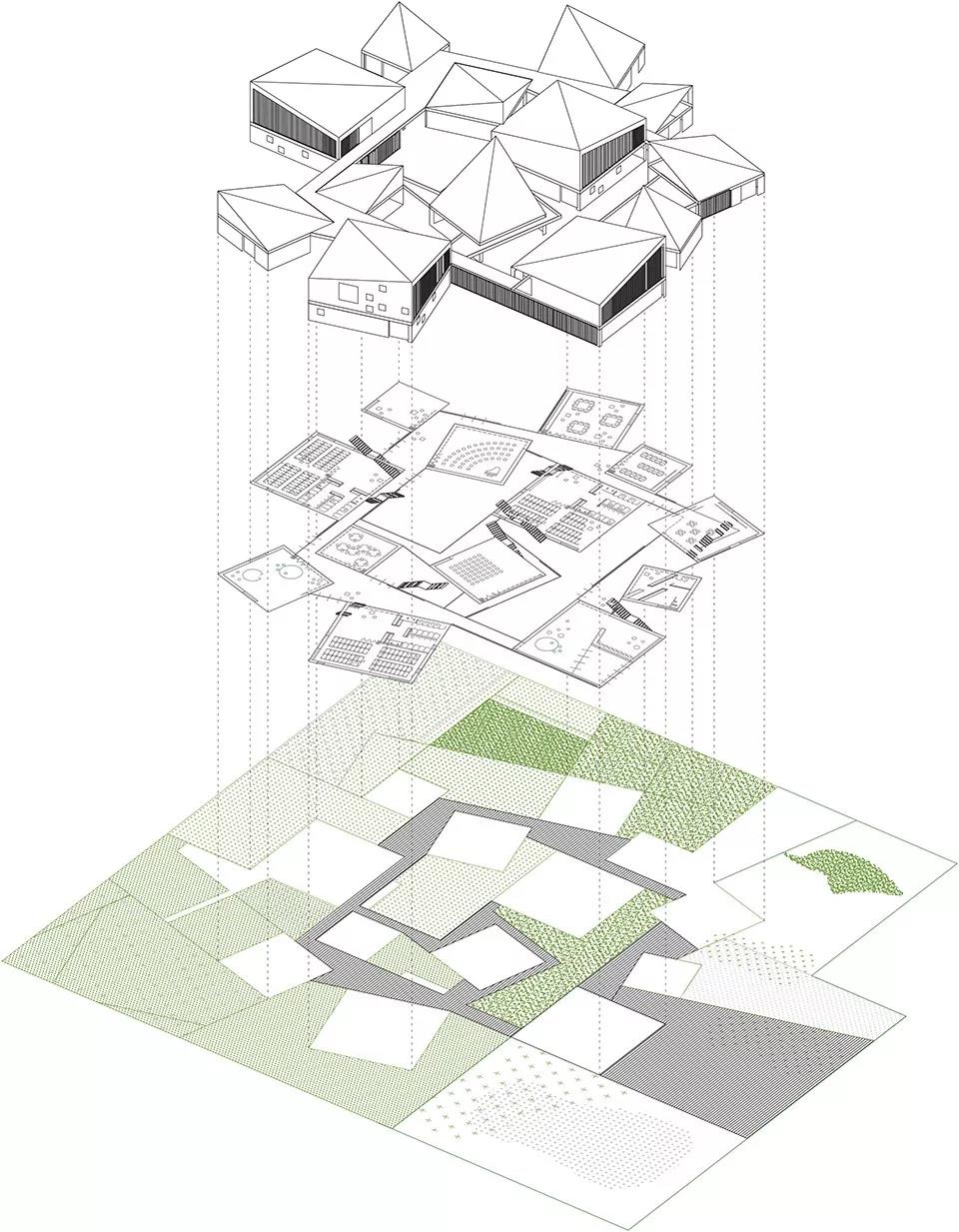 ▼用若干“小屋式”結(jié)構(gòu)分解總建筑體量 ©Hao Hongyi 郝洪漪