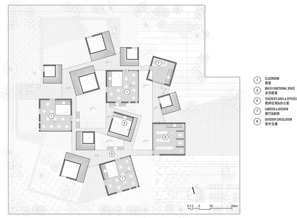 本次設(shè)計的關(guān)鍵點,是對尺度的把控。我們設(shè)計的組團式建筑,用若干“小屋式”結(jié)構(gòu)分解了幼兒園所需的總建筑體量,并以一片多功能的戶外活動場將每棟“小屋”集結(jié)在一起。這種室內(nèi)外密切銜接、高度混合的空間關(guān)系,不僅呼應(yīng)了鄉(xiāng)村的原生肌理,對兒童早期教育而言更是十分重要的場所環(huán)境。