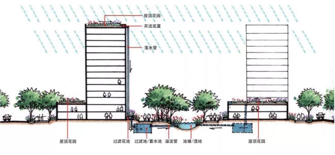 在可持續(xù)發(fā)展方面,HPP所推崇的循環(huán)經(jīng)濟(jì)概念也被植入到設(shè)計(jì)的細(xì)節(jié)之中。通過建筑屋面的防水層上鋪以種植土,并種植植物,使其起到防水、保溫、隔熱和生態(tài)環(huán)保作用。將自然途徑與人工措施相結(jié)合,在確保城市排水防澇安全的前提下,最大限度地實(shí)現(xiàn)雨水在城市區(qū)域的積存、滲透和凈化,促進(jìn)雨水資源的利用和生態(tài)環(huán)境保護(hù)。