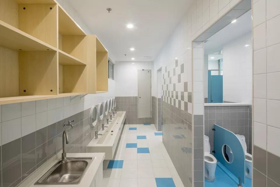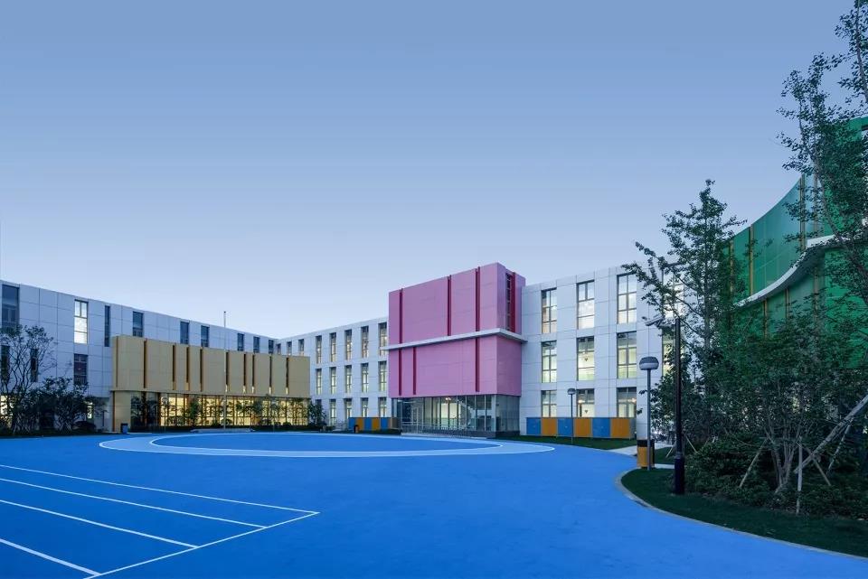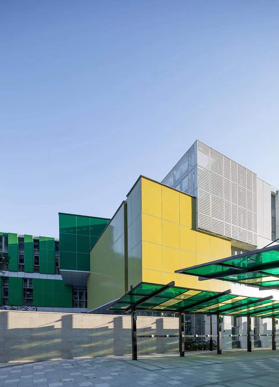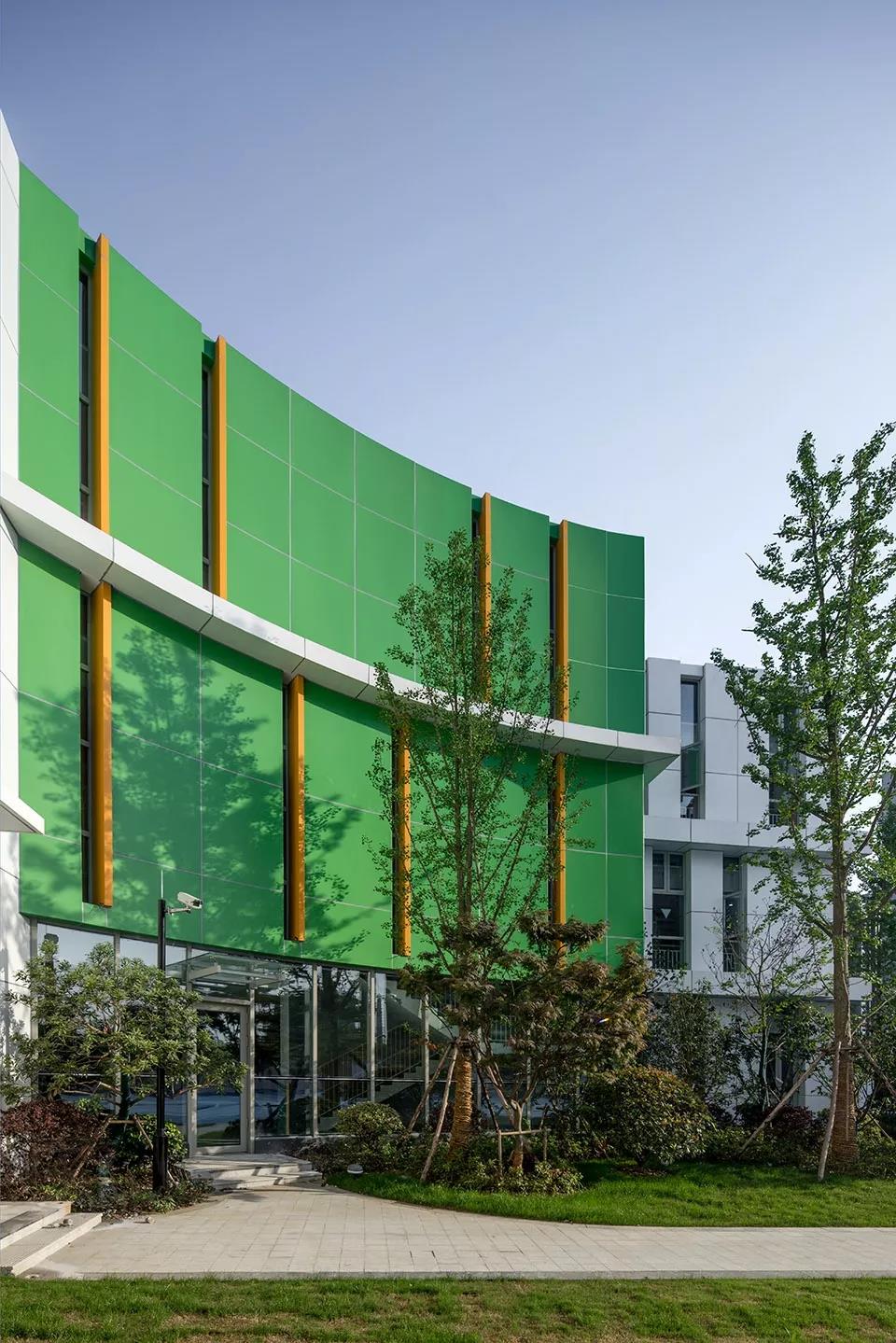 片區里所有的居住建筑,主要體現兩種色調:灰白和土黃。建筑師覺得這不應該是美麗的湖邊的色彩,于是希望給這個湖邊的環境加入一抹亮色,給這個社區增加更多的生氣,讓居民從周邊高樓上看下來,能立刻找到這個以幼兒園為“注點”的濱湖空間,而不至于迷失在灰白和土黃的鋼筋水泥的“森林“里。