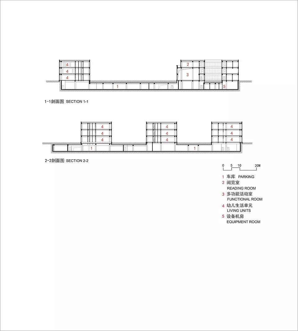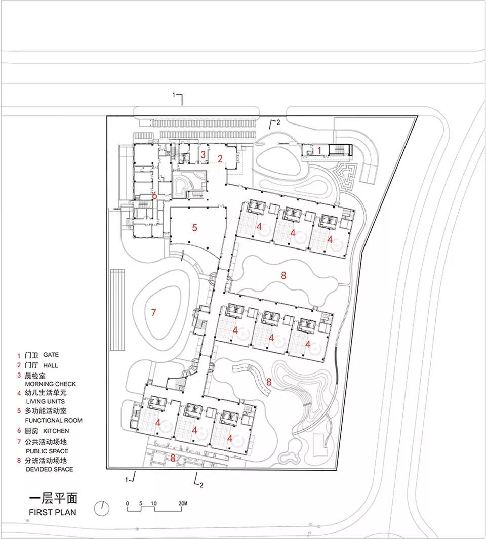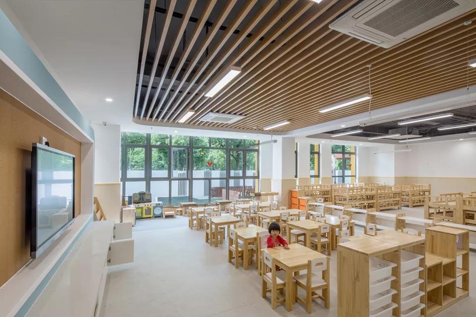三排教室由北向南平行排開,這樣的格局非常符合幼兒園的班級集成方式,可以讓幼兒園有很靈活的劃分年級組的選擇。比如,可以將小、中、大班三個年級,各自集成在三個不同的樓層;也可以將三個年級各自集成在不同的三棟樓中。建筑師給了園方充分的靈活度,來應對使用中不時變化的要求。