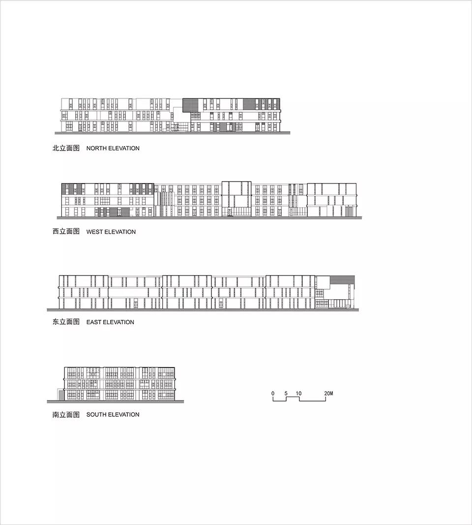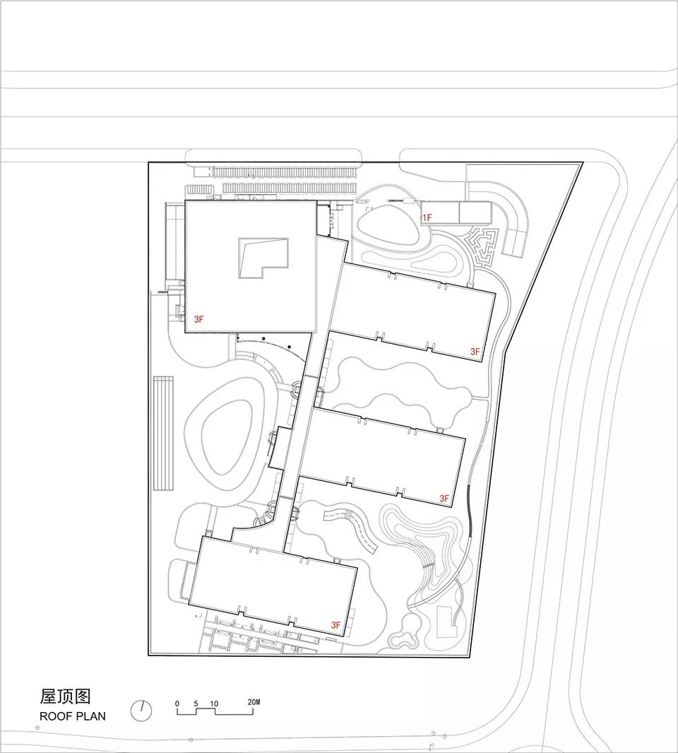 一條南北貫穿的連廊將三排教室連接起來,三排教室和連廊整體在平面上旋轉約10度,連廊基本與東邊界平行