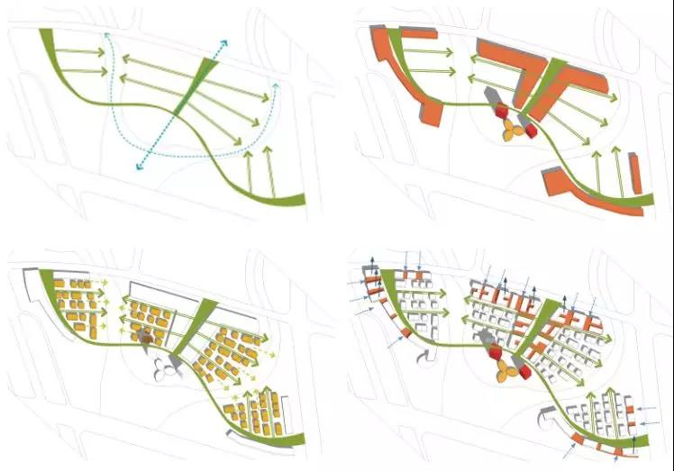基地被西部干線劃分為科研辦公和配套居住兩個區域,然而科研辦公用地又被現狀河流分為三個地塊,設計之初,希望將三塊科研用地作為一個地塊設計。