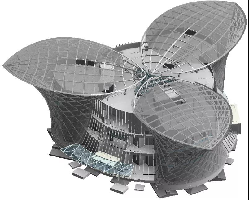 設計體型的復雜化以致于設計一開始就采用BIM參數化手段全過程設計,由于體型復雜,建筑、結構、幕墻三個專業的定位、構架、分割需相互契合,設計的過程中,由上述三專業人員在同一個BIM模型中協同工作。