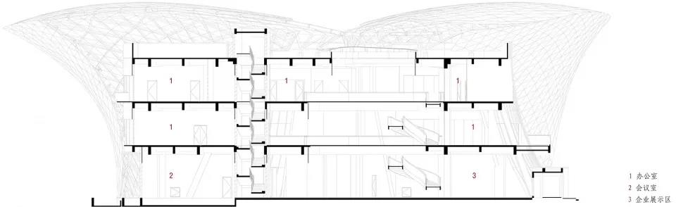 內部空間層次豐富功能分布清晰,一層為展覽區域,二層為企業展示區,三層主要為辦公區。各層的功能分區結構具有可調整性,展覽、培訓、會議空間形式多樣,能靈活的適應各種使用要求。意在促進創新氛圍的營造,體現活力性、實現非正式交往與正式交往并行,其空間場所更具開放性、場所性、宜人性、多元性、生態性、地域性。從交往場所上看,空間可以劃分為正式交流空間、非正式交流空間。
