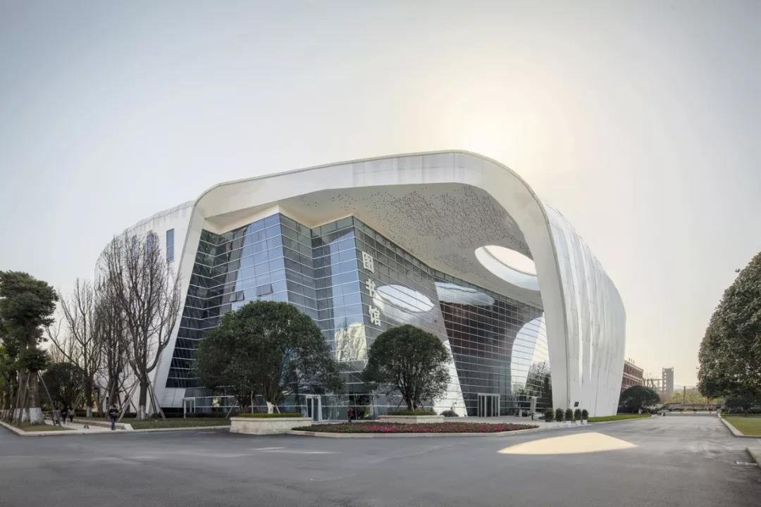 圖書館形態源自燈籠花優雅的外形,北側和東側以實體墻面為主,宛若花朵枝葉包裹;西側和南側是如燈籠花瓣晶瑩剔透的玻璃幕墻。幾條流動的曲面勾勒出花朵的動感形態,與其周圍教學樓、宿舍樓相映成趣,成為整個校園的地標和視覺焦點。