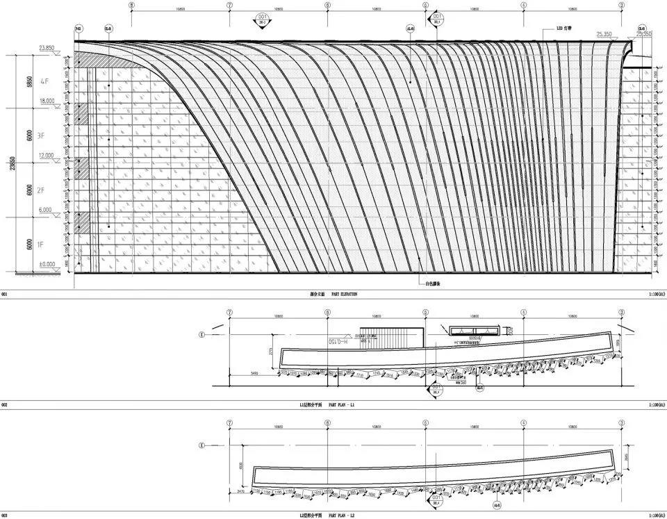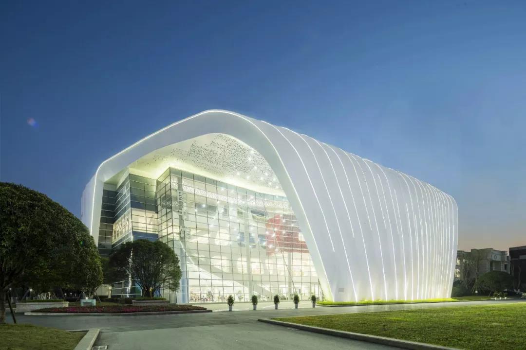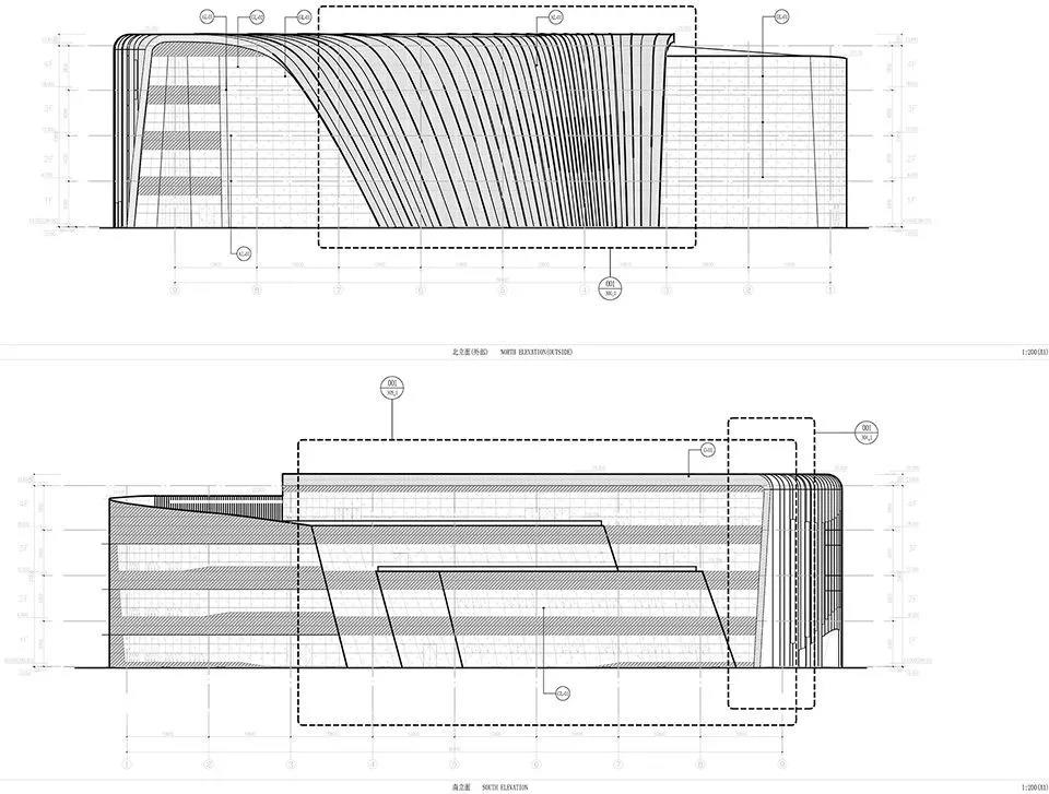 北側屋蓋外部全采用鋁板的材質,每塊鋁板都是平行四邊形,通過平面上角度的變化形成鋸齒形的平面效果,在陽光下形成豐富的光影變化。細節設計上,在每兩組鋁板相交的陽角處設置長短不一的LED燈帶,兩塊鋁板交接處預留豁口,豁口處設置透明亞克力板內藏LED燈帶。夜晚形成如瀑布般的效果。