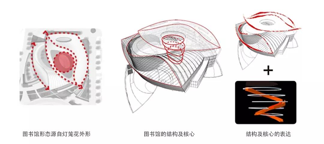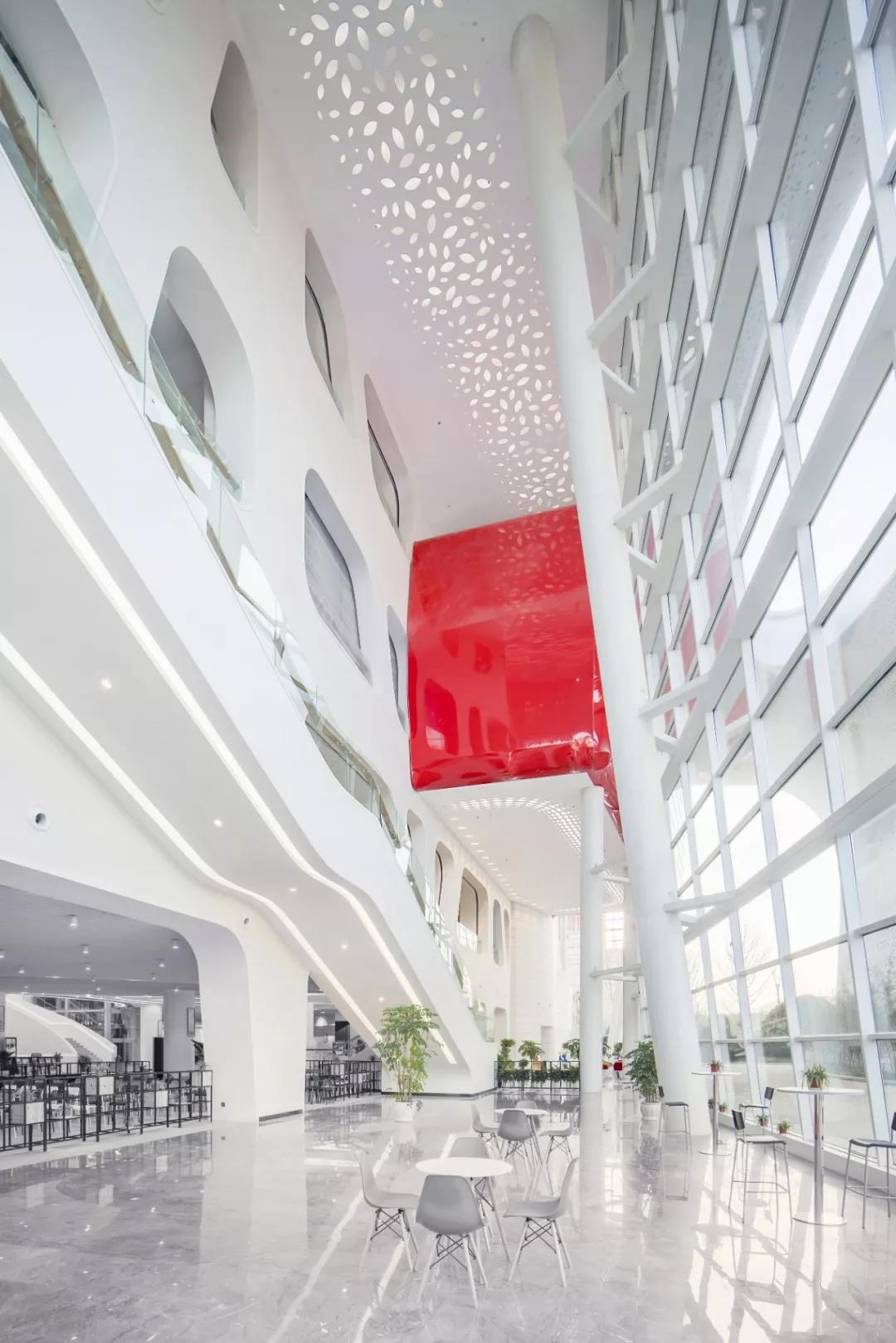 北側圖書館主入口作為校園中軸線終點的背景,與校園肌理完美結合。在圖書館中心是層層退進的橢圓形主中庭,通過特色旋轉樓梯宛若燈籠花蕊,成為整個建筑的核心。