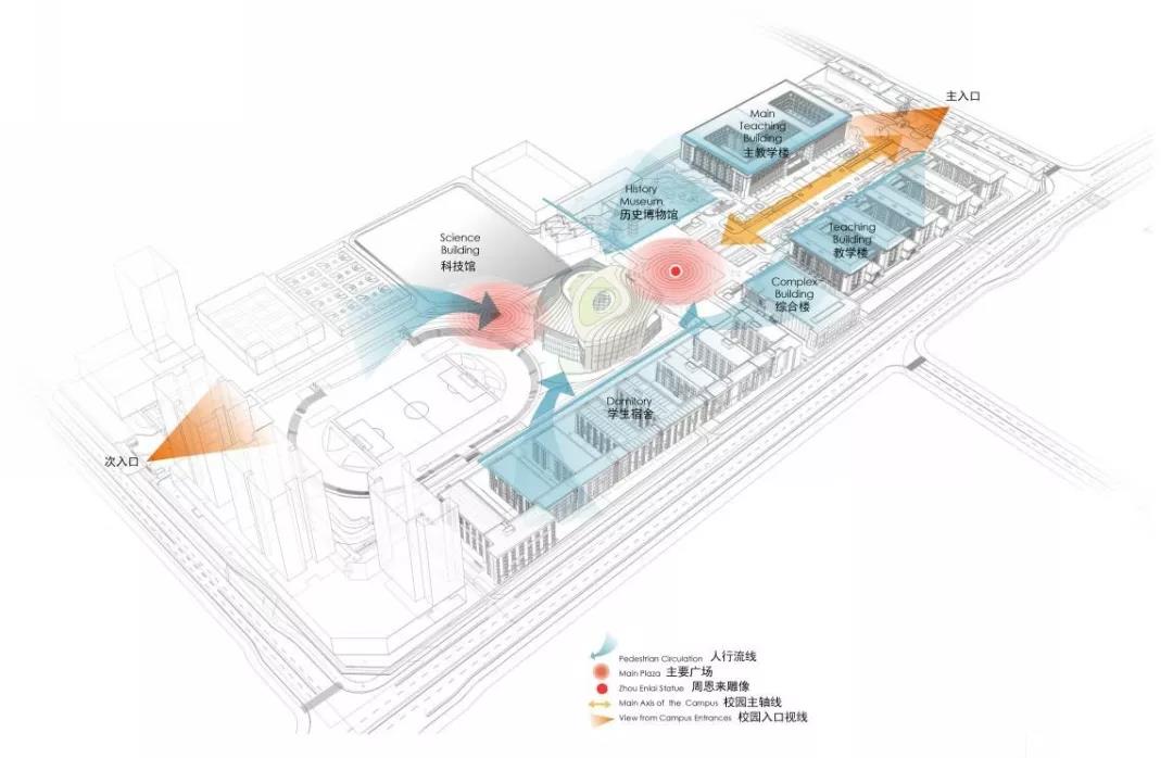 圖書館通過玻璃幕墻、穿孔金屬板相結合,形成各立面的特色:北立面面向主軸線和周恩來雕像,運用中國古典建筑“影壁”的概念形成進入圖書館的“過渡空間”,同時成為周恩來塑像的背景,起到更好的烘托作用。南立面正開闊的運動場,西側以穿孔版和玻璃為主,形成水平向的包裹效果,同時提供較好的視線廊道。