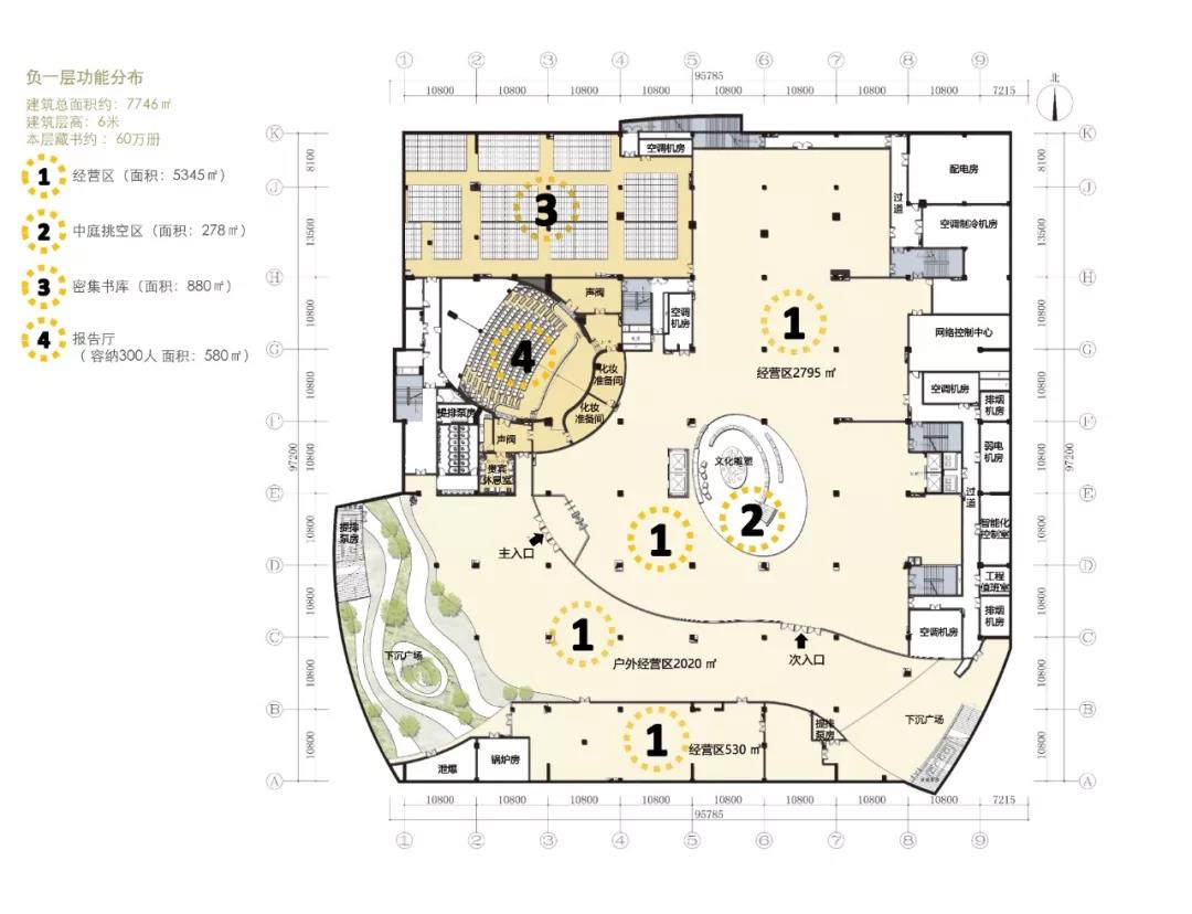 在建筑北側和西南側設置圖書館入口,東側設置貨運入口,空間組織注重建筑空間的趣味性,在建筑的西南側設置下沉廣場,有效的利用了地下空間,巧妙的解決了地下空間出入口問題。