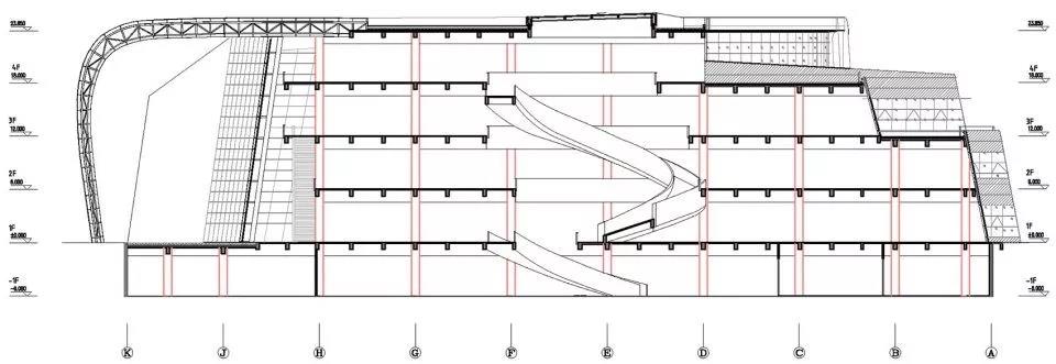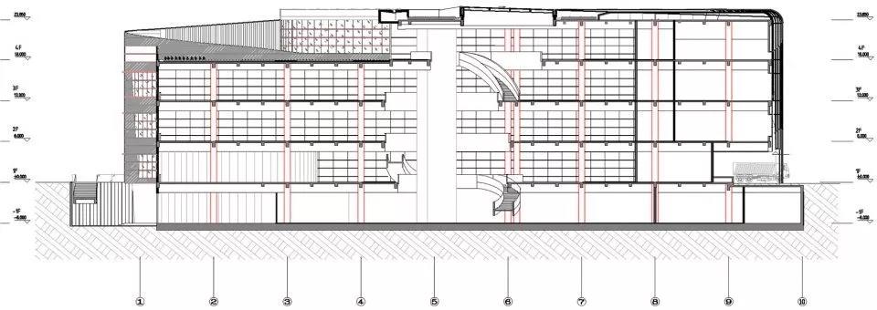 層層錯落的中庭與螺旋樓梯結合在一起,形成了極富動感的中庭空間。不同于傳統圖書館單一的知識傳播,現代圖書館更加強調空間的共享和信息的交流,沿著室內中庭螺旋上升的樓梯串聯起各層空間。