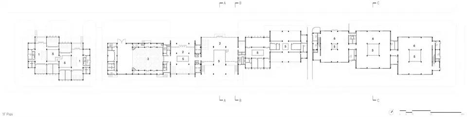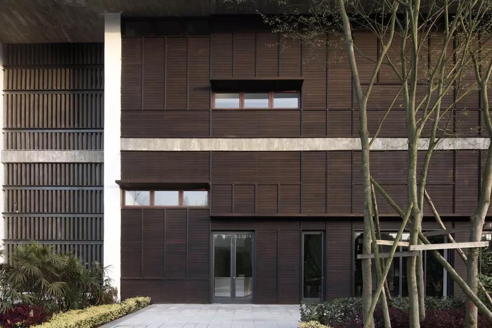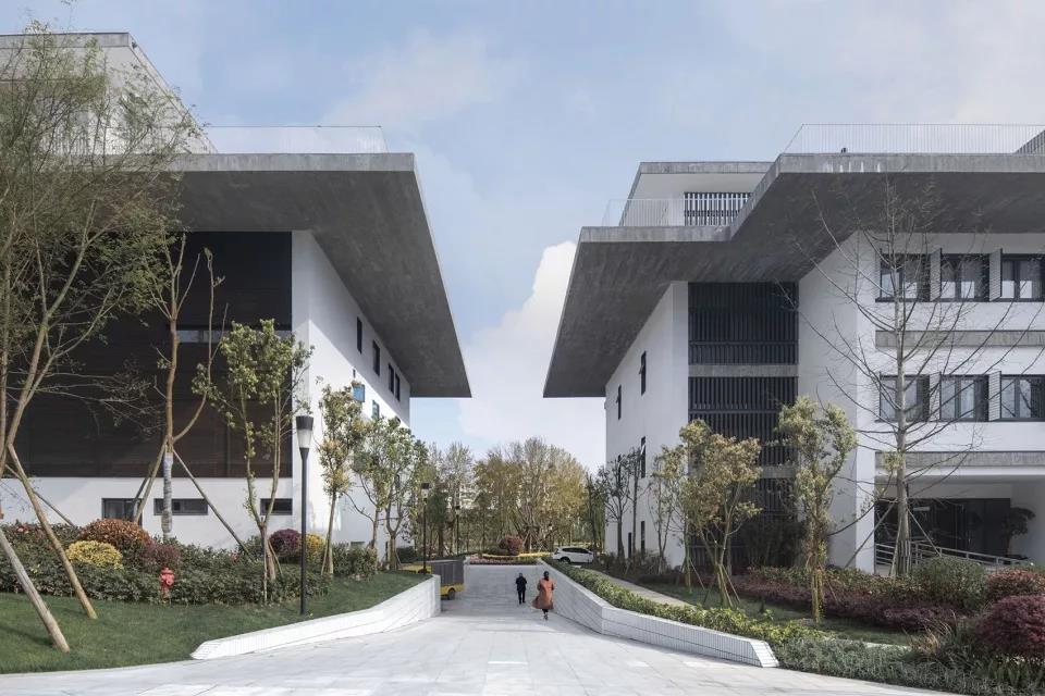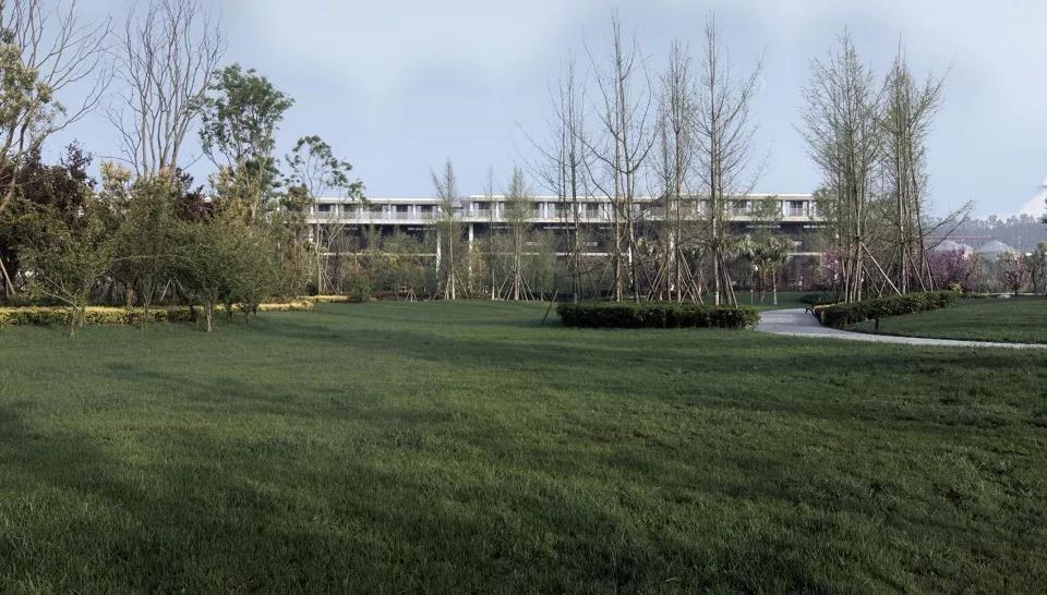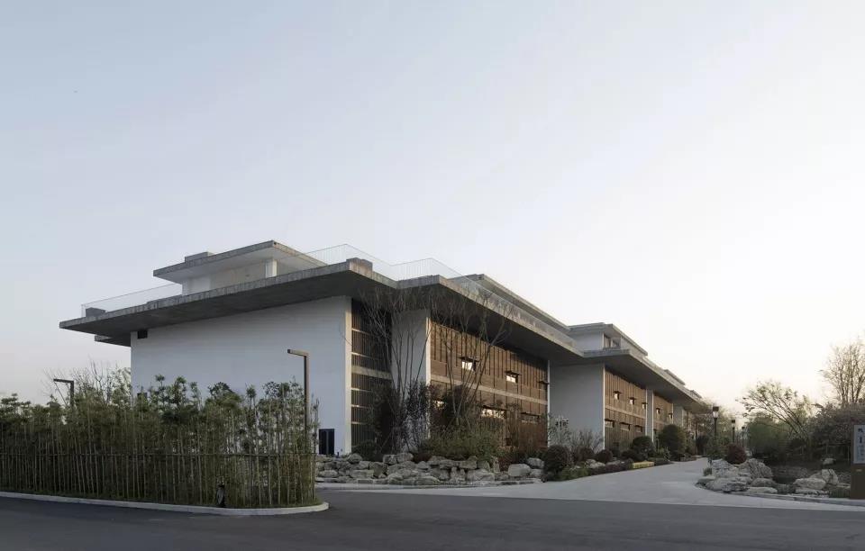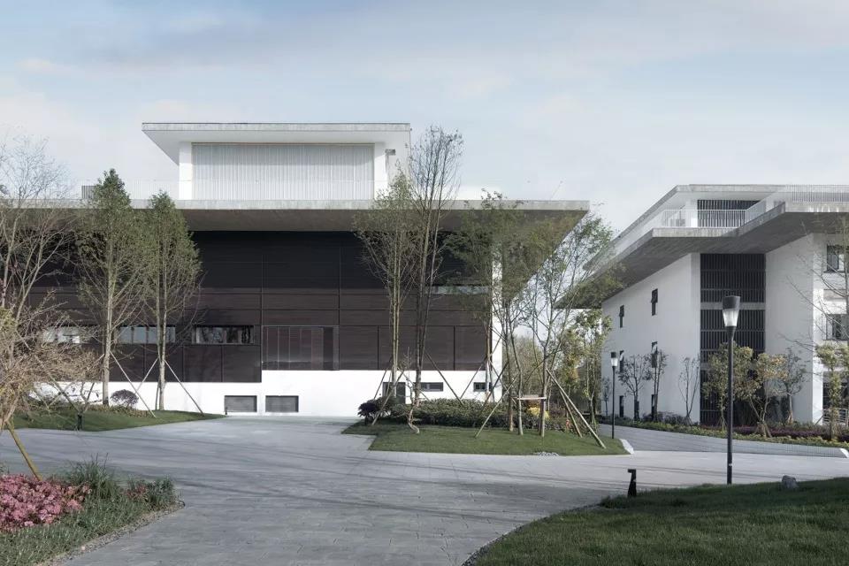 文化中心綜合體被視作連接工業園區與自然景觀的紐帶,其建筑空間由一系列帶內院的館所以線性排列的方式組成,而形式語言則由深檐和木板墻等低調的本土化詞匯所構建。