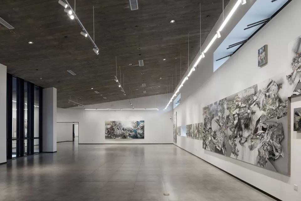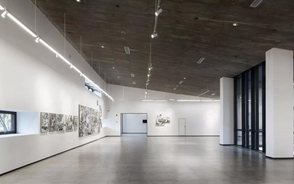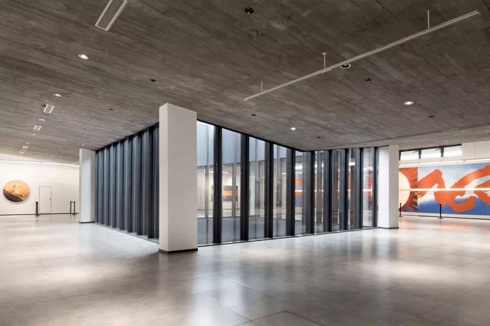 館所的斷面中,無梁混凝土樓板從中部朝兩側懸挑而出,好擬一把張開的傘。這把“傘”從檐口到中心處逐漸由薄變厚,并在最厚的區域承擔藏匿暖通管道的需要。