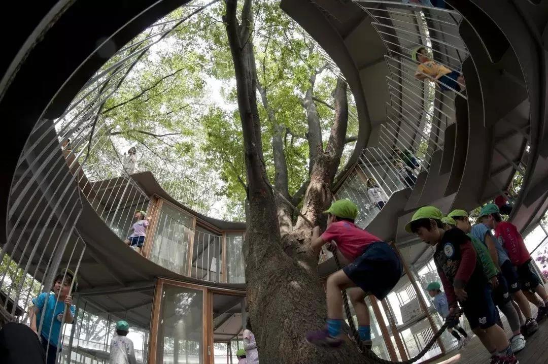 沒錯,小朋友們特別愛爬樹,有時候大樹上能爬上去十幾二十個小孩,簡直就是一座“猴山”嘛。手冢貴晴還在樹木和屋頂的間隙專門設計了防護網,小孩子即便掉下來也無妨。