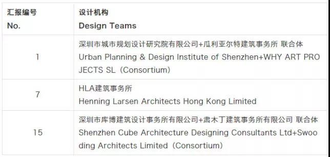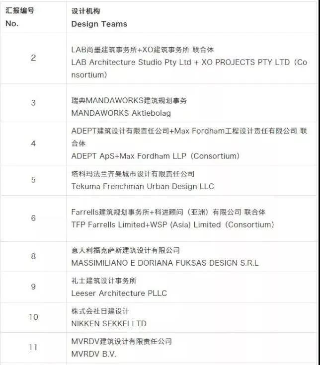 參賽的設計單位包括MDRDV, Miralles Taglieabue EMBT,Massimiliano Fuksas,LAB, TFP, Henning Larsen,NikkenSekkei,CUBE,QUAD擴道建筑設計等等。