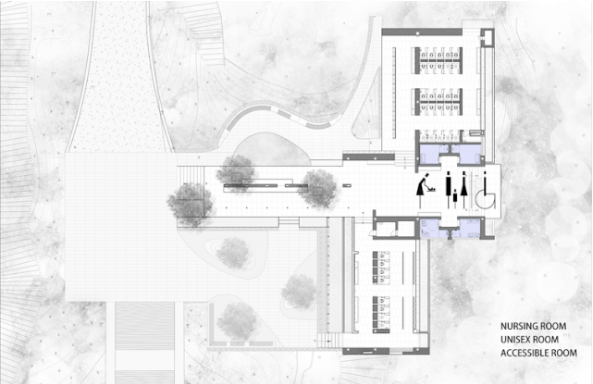 ▼休息長廊與觀景平臺作為空間主軸串聯起北側的女衛生間、南側的男衛生間、中部的母嬰室、殘疾人衛生間及第三衛生間