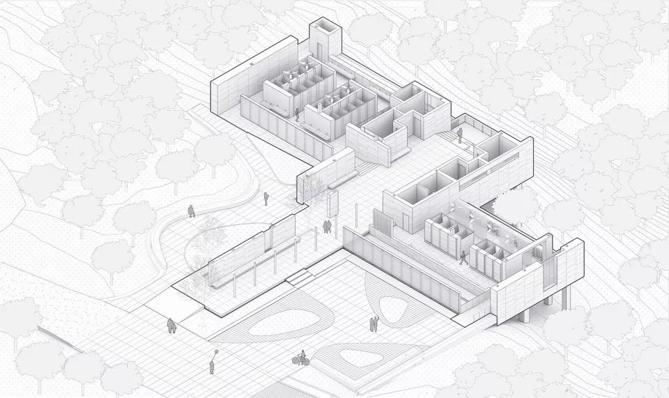 實現建筑與自然的和諧相融,是我們設計的首要原則。在總體布局上,建筑以休息長廊串聯南北兩翼的男女衛生間,打通金桂路一側廣場與東側山林的視覺通廊,東側主體以吊腳樓的方式輕輕落在山坡之上,恰似一只鳶鳥棲息在山林之間。