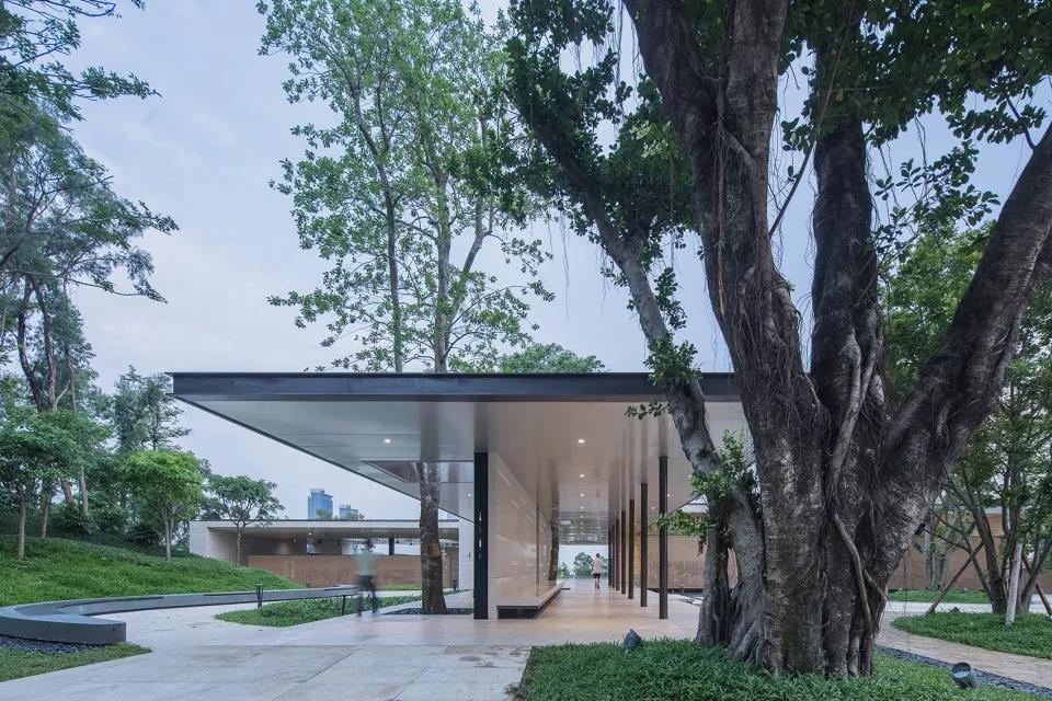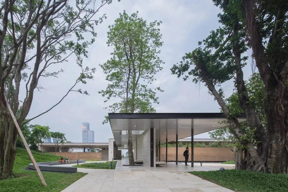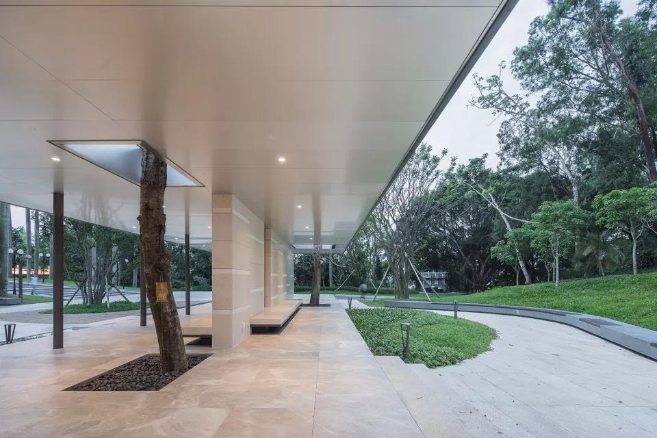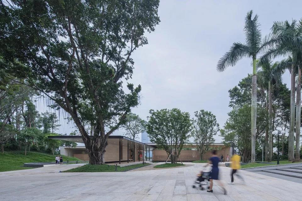 在重塑場所景觀的過程中,基地上的雜木灌木被規整清理,樹徑較小的普通喬木被遷移至公園其他位置,三棵姿態優美的高大喬木得以保留。在這里,自然是空間的主角,樹與廊相依相生,一起見證光陰荏苒、歲月變遷。