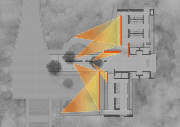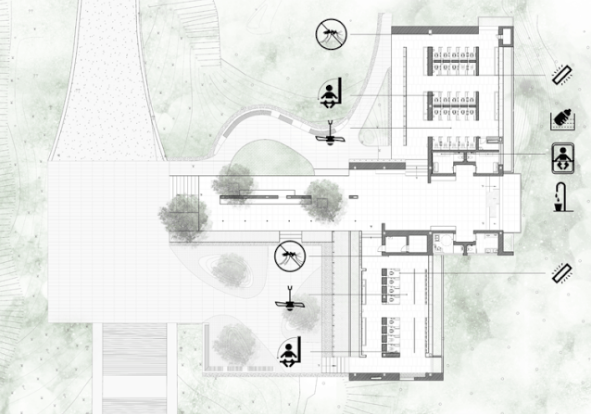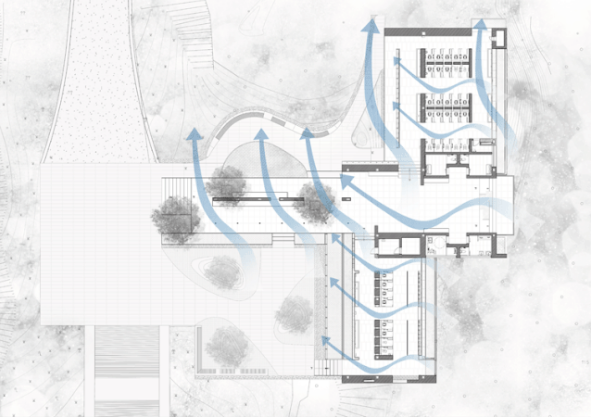 設計充分利用公廁位于山頂開闊地帶的地理優勢,實現最大程度的自然對流通風。通過平面均勻分布的開口設置,導入自然季風,通過屋頂下的遮陽空間的降溫,形成舒適的低溫氣流。即使在最悶熱的夏季,公廁及休息長廊內皆可保持舒爽的體感溫度。